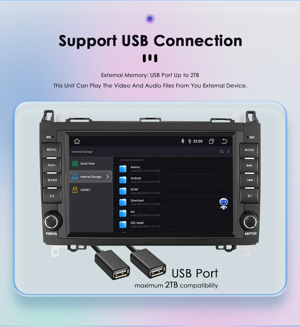 External Memory: USB port up to 2TB,this unit can play the video and audio files from your external device.