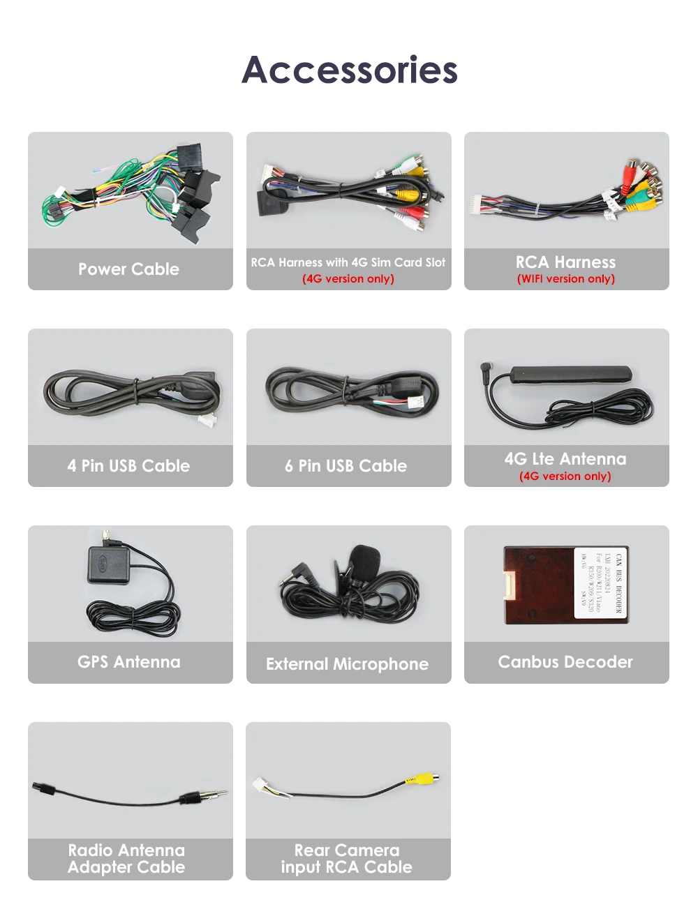 Standard Accessories: which ship with the head unit together(but please pay attension to the red words of accessory whether can get or not which depends on the item option you choose to buy it)