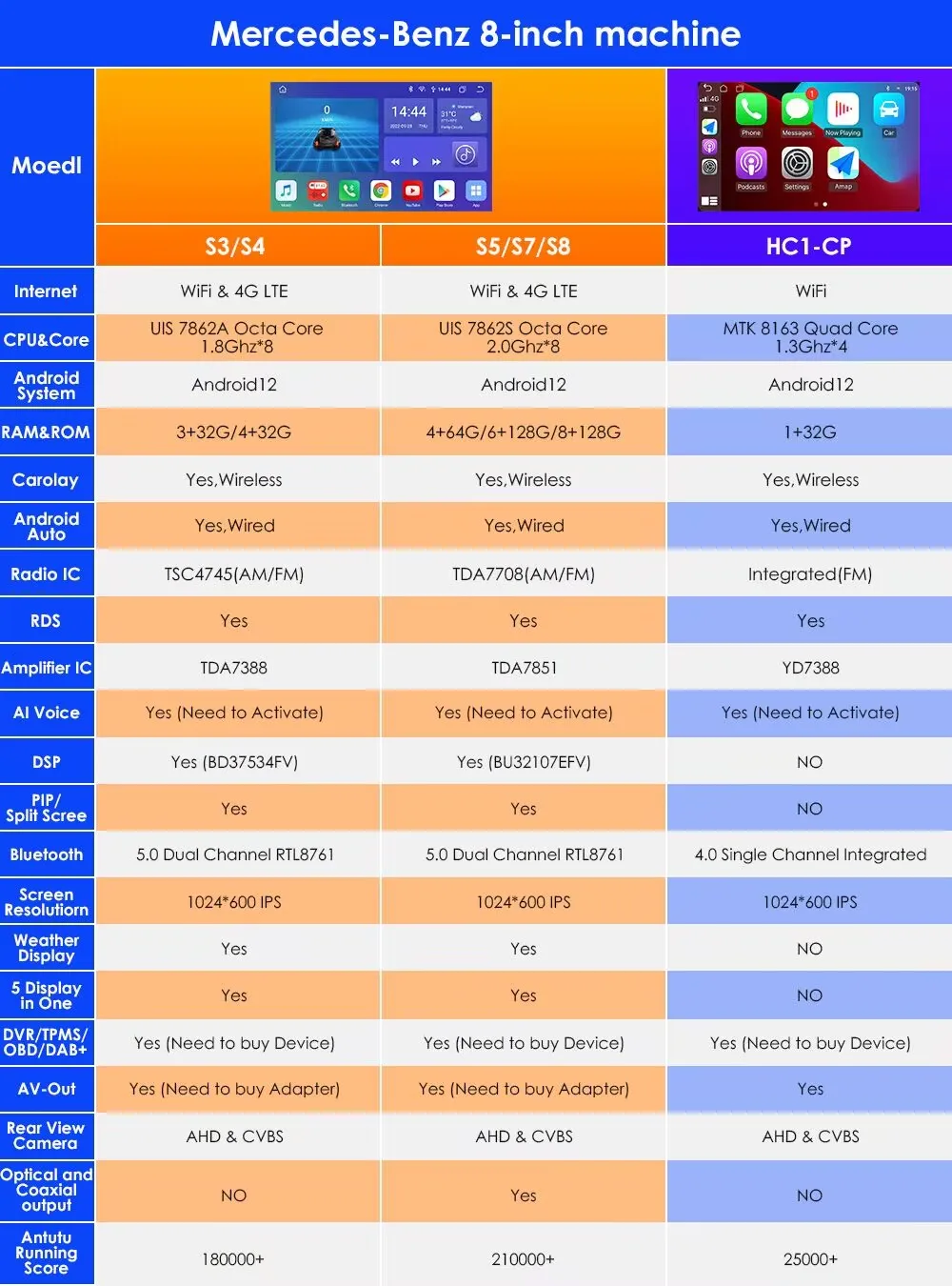 User interface: S Series(can set as 4 color type: Purple/ Dark blue / Black / Golden) included S8/ S7/ S6/ S5/ S4/ S3 version; and A Series included HC1 Carplay auto version.