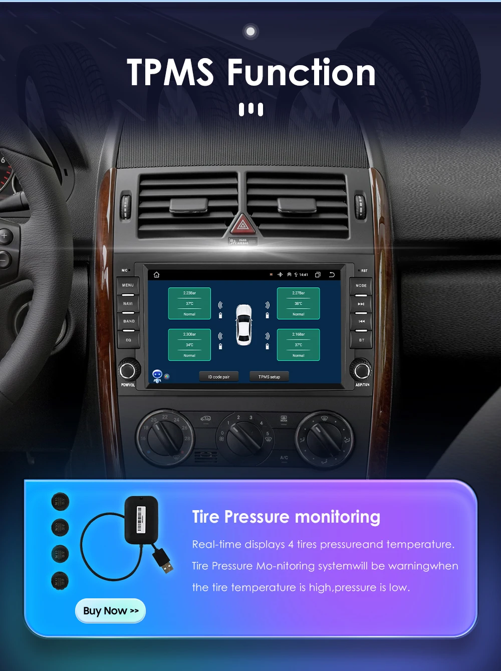 TPMS Function( Needs to order separately) : Tire Pressure Monitoring: Real-time displays 4 tires pressure and temperature,Tire Pressure Monitoring system will be warning when the tire temperature is high, pressure is low.
