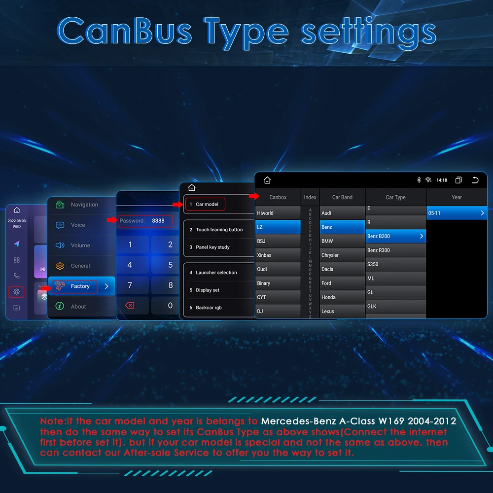 Canbus Type settings: Factory--8888(Password)--Car Model--LZ--Benz--Benz B200--05-11--ok.