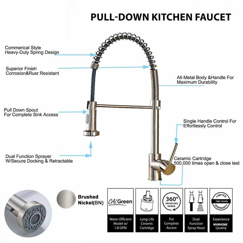 Brushed Nickel Spring Pull Down Kitchen Faucets Stream Spray Head Hot Cold Water Tap Brass Rotation Kitchen Mixer Tap Crane