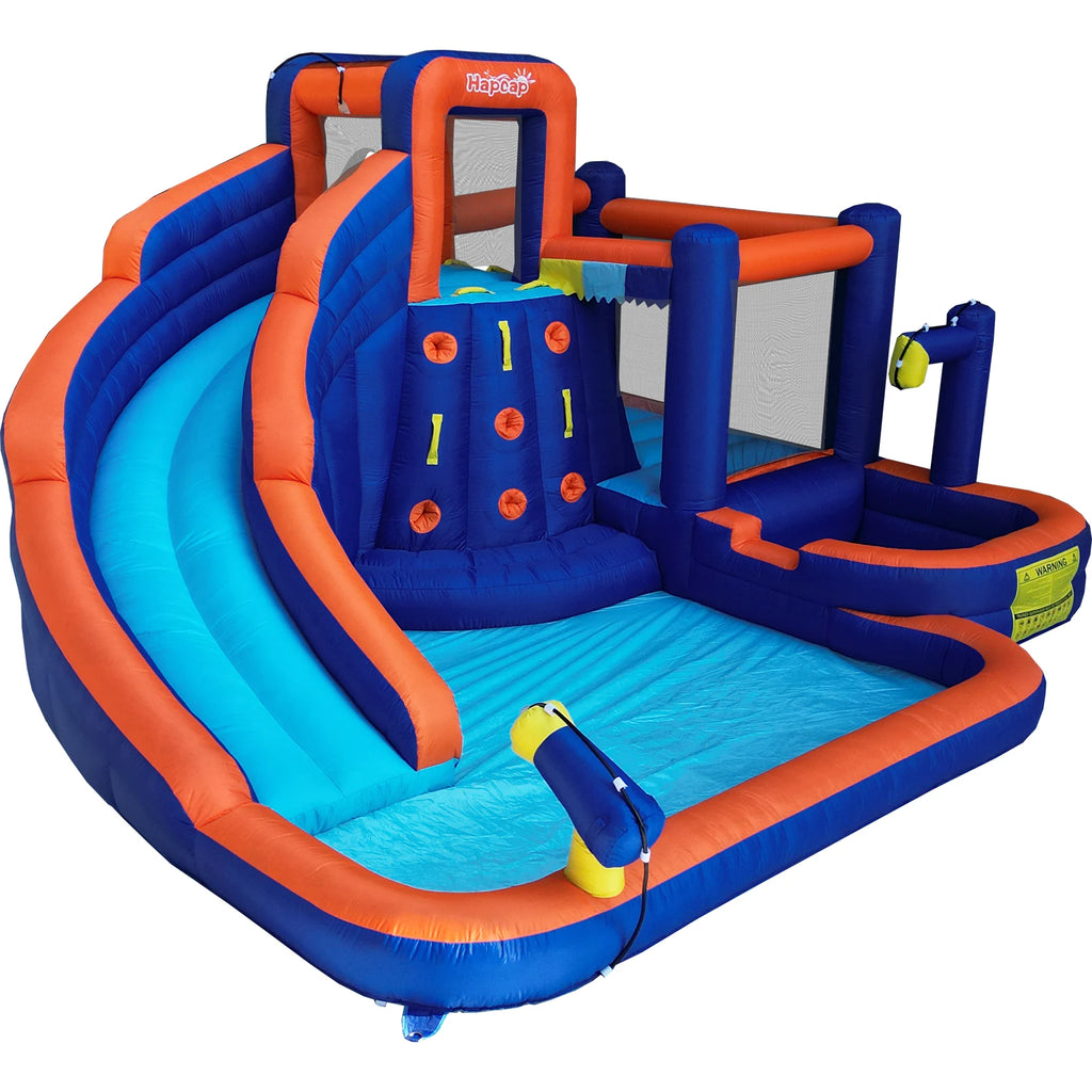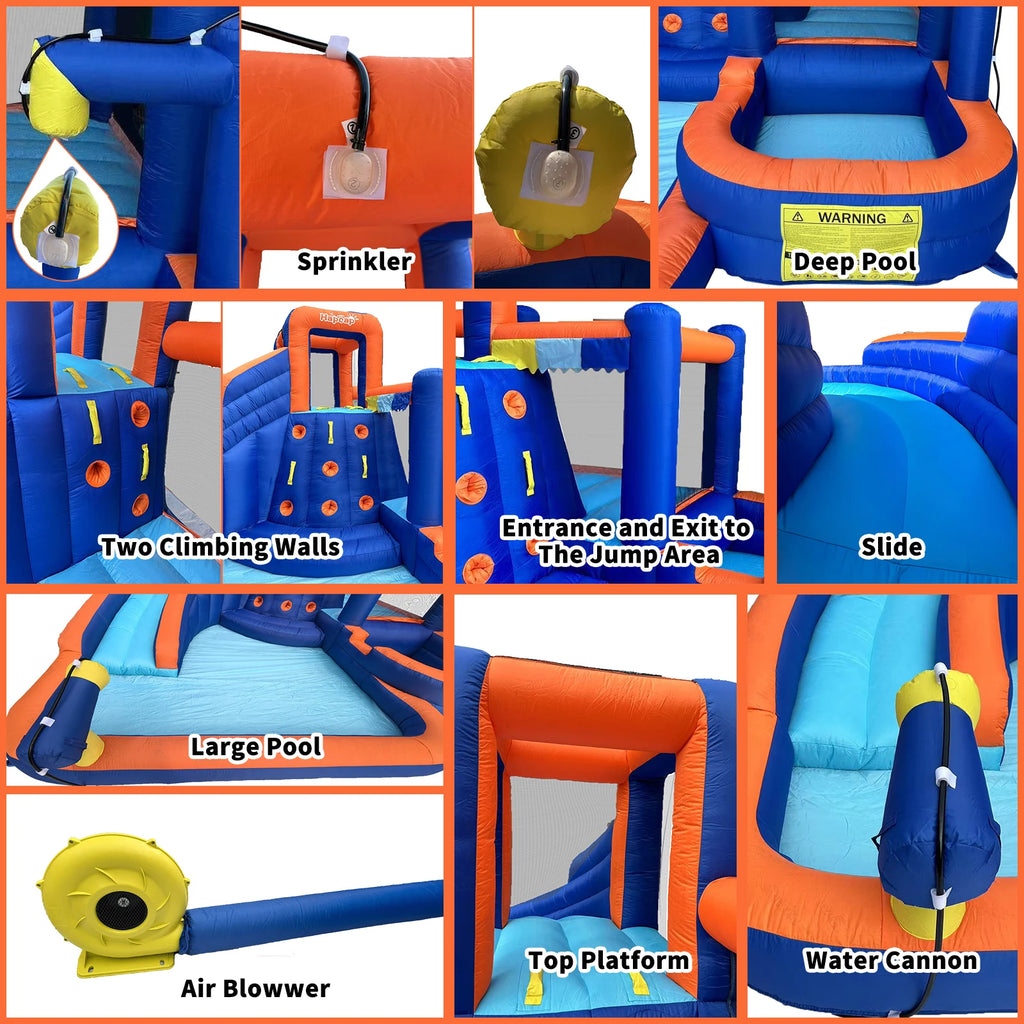 【Simple Theme Design】This Simple and clear structure bounce house is designed with five main functional areas: a large curved slide, two climbing walls, a shallow pool, a small-sized deep water pool with shower spray, and a small-sized jumping area.There is enough space between the five major areas.Children can enjoy big sliding, climbing, jumping, water gun battles, and happy shower.The water park combines a variety of functions and entertainment in one.