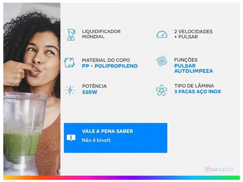 Se você gosta de fazer receitas deliciosas mas não abre mão de praticidade, você precisa de um liquidificador. E sabendo disso a Mondial trouxe o Liquidificador Easy Power L-550. Disponível na cor preta ele possui copo com 1,5 litros de capacidade útil e 3 lâminas em aço inox, que dão mais eficiência na hora de triturar qualquer alimento, sem contar que o seu copo é resistente a quedas e riscos. Tem duas velocidades, função pulsar e ele é ideal para preparar sucos, vitaminas, bolos ou qualquer outro alimento com muita facilidade e eficiência. Tem potência de 550W e material do copo em polipropileno. E tudo isso com o selo INMETRO, que garante a qualidade e eficiência do produto.