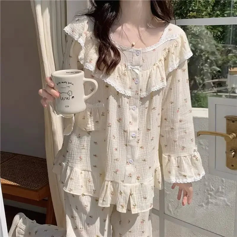 Lace Sleepwear Women Pajama Sets Floral Piiama Spring Sets 2 Pieces Korean Long Sleeve Night Wears Sleep Button Ruffle Home Suit