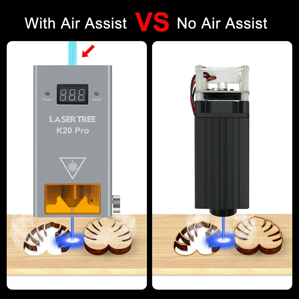 When cutting with this laser head, the air assit system will blow air through the air nozzle. That will bring you excellent cutting experience and greatly reduce burned marks.