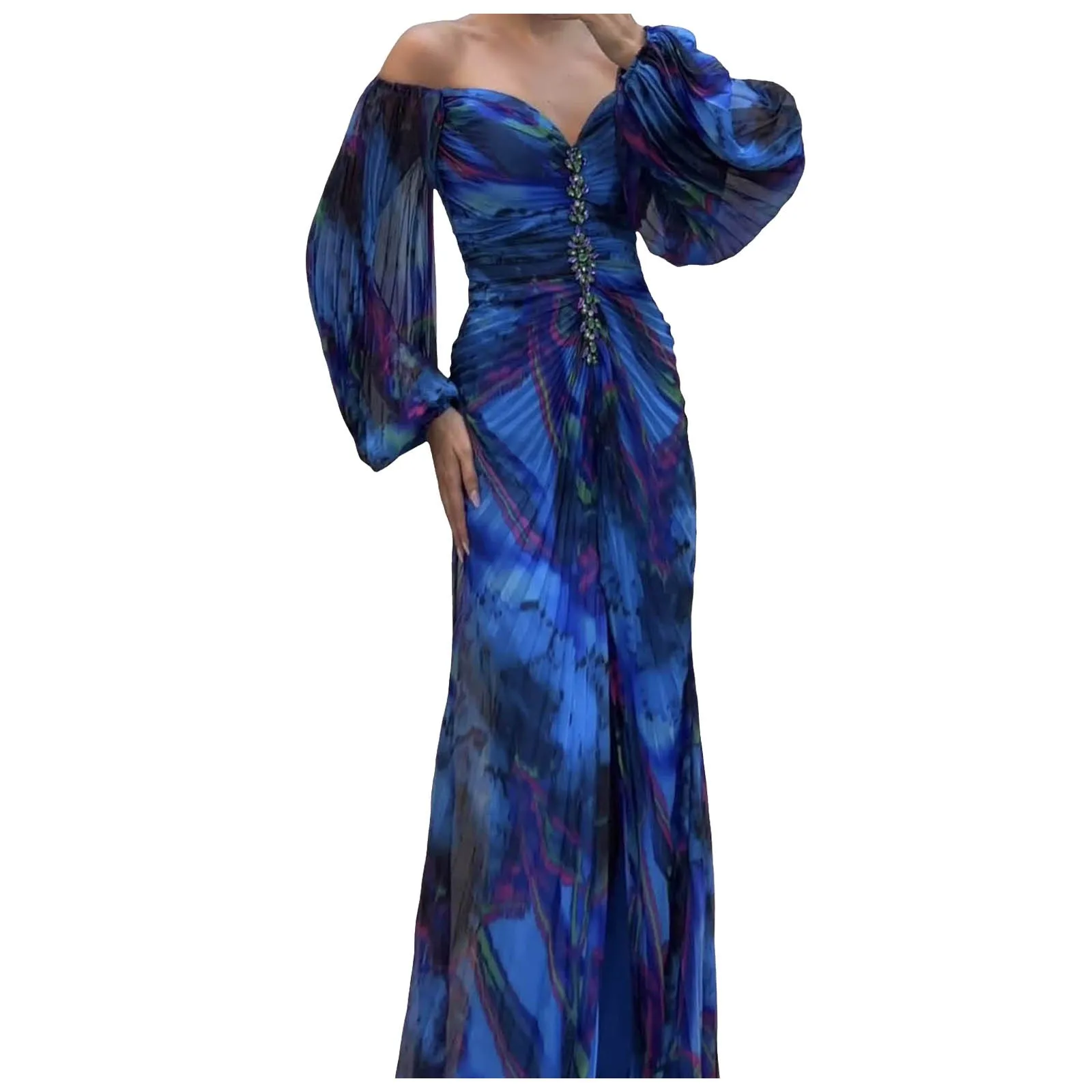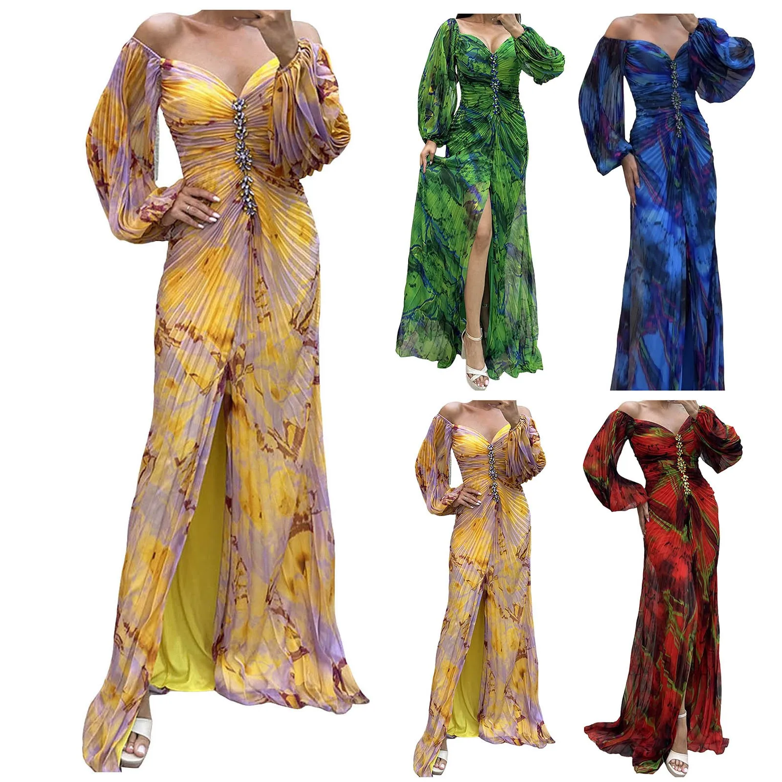 Printing Ladies Long Dress Gathering Pleated Long Sleeved Maix Dresses For Womens Wedding Guest High Slit Cocktail Party Dress