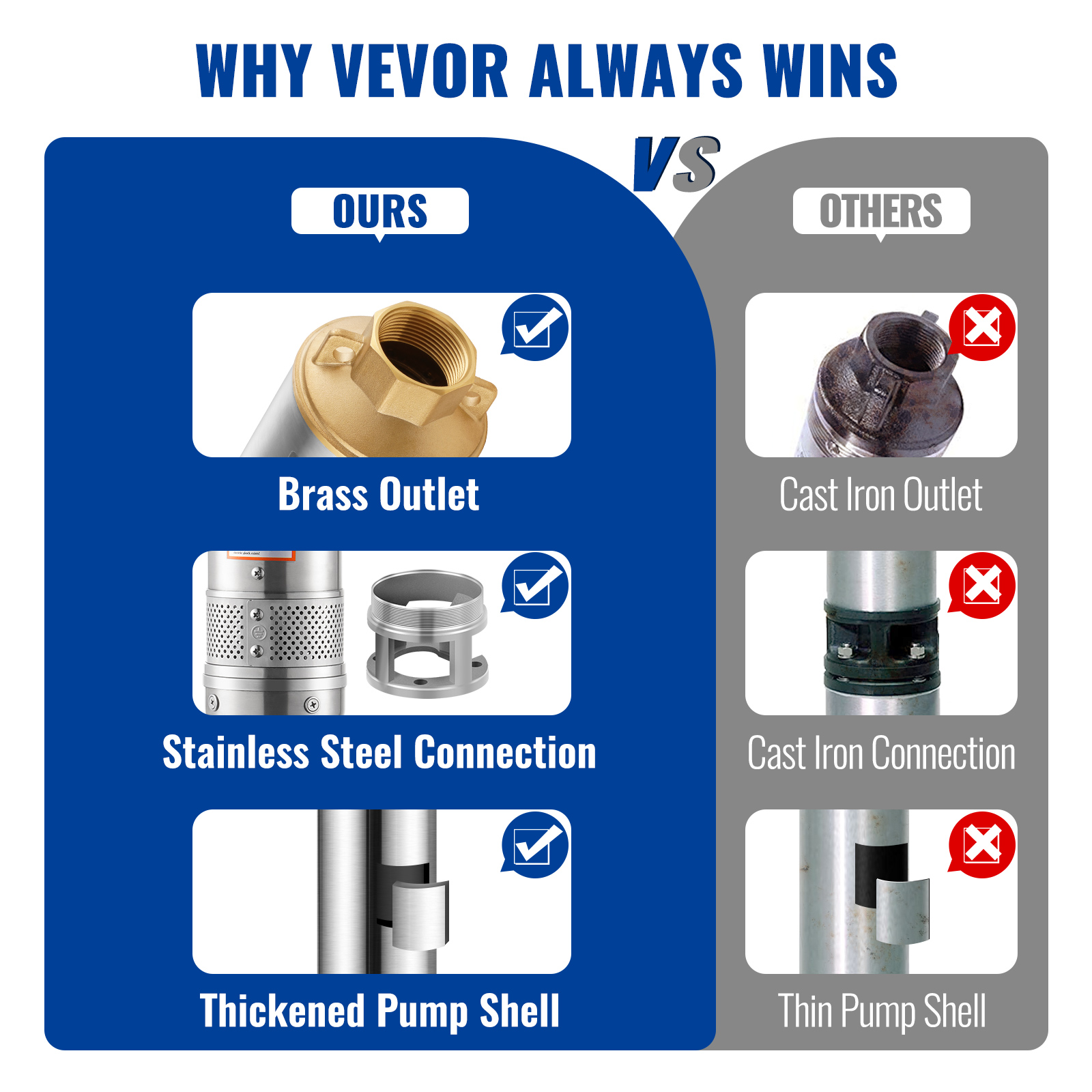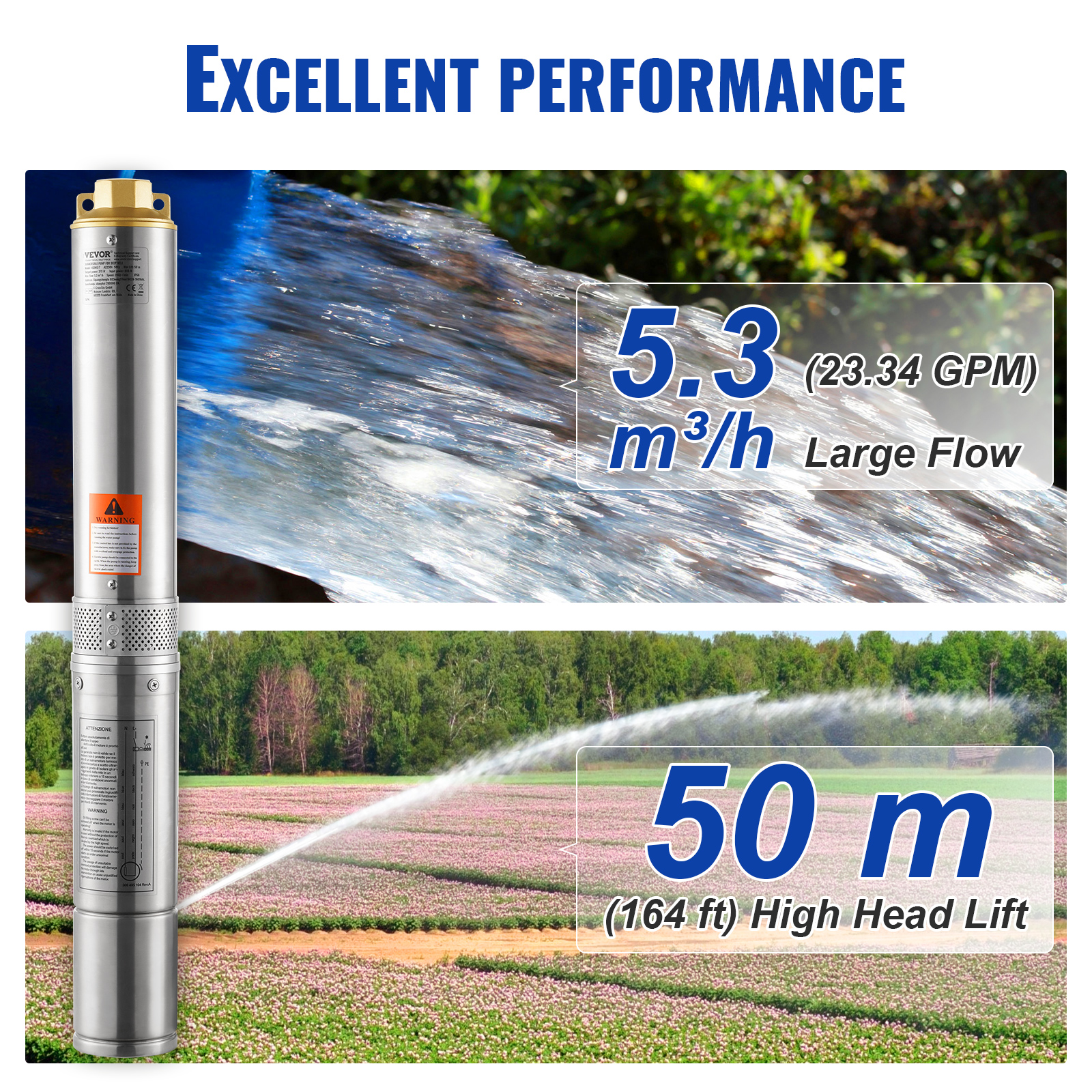 【Upgraded Stainless Steel】: The whole frame of our deep well pump is unlike anything on the market. It is made of stainless steel, including the outlet and connecting components. You don't have to worry about it becoming rusted or corroded after being underwater for a long time. With CE certification and IP68 waterproof grade. Stop wasting time! The perfect choice is in front of you!