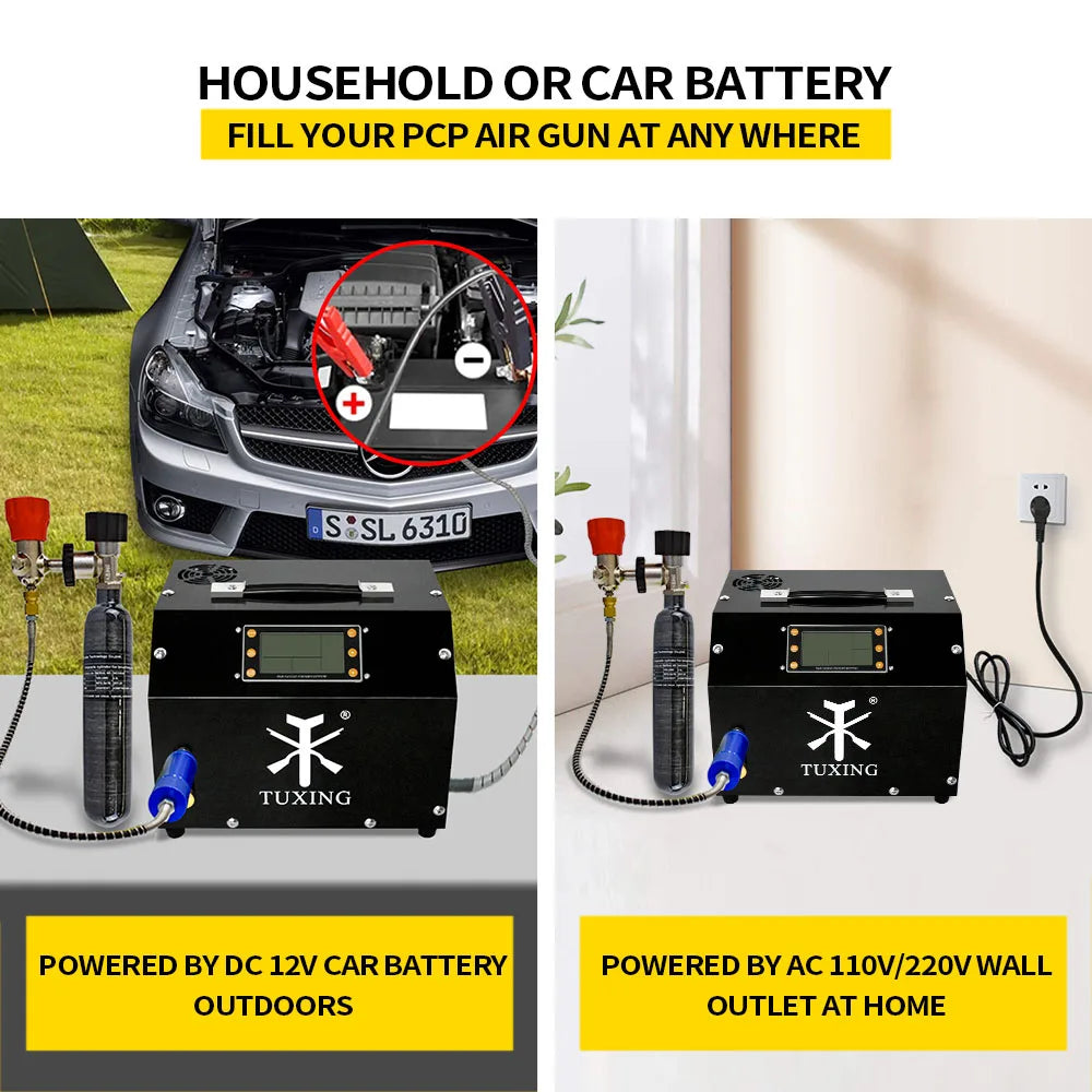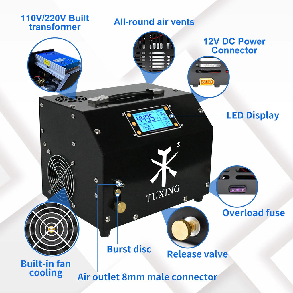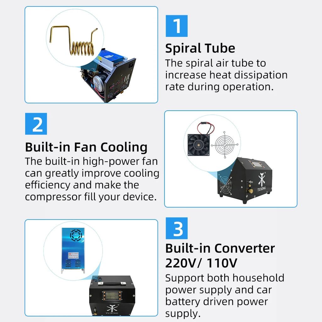 TXET063 is a digital control portable compressor, light weight, small size, easy to carry, working pressure 300bar/4500psi/30mpa, oil and water free, built-in fan cooling and drain system.