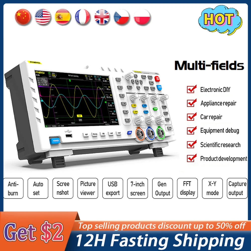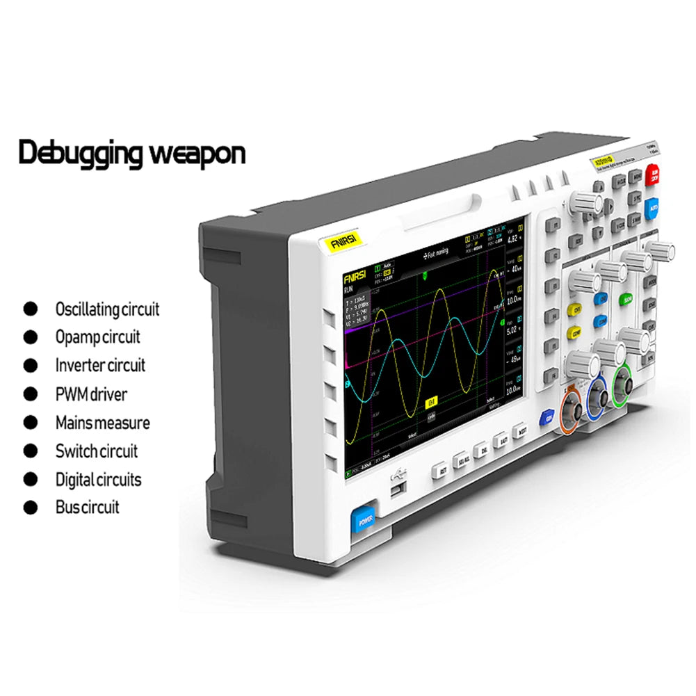 FNIRSI-1014D is a two in one oscilloscope and signal generator, the real-time sampling rate is 1GSa / s and with 100MHz* 2 ana-log bandwidth, with 7inch TFT LCD display screen, the built-in high-voltage pro-tection module can tolerate up to 400V continuous voltage, without worrying about the oscilloscope burning accident caused by the probe not moving to 10x gear, built in DDS function signal generator and the industry's ori-ginal chopping output (@ 2.5vpp), all signal frequency step is 1Hz, support 14 kinds of standard function signal and a customizable chopping signal, chopping The output device intercepts part or the whole part of the complex signals measured by the oscilloscope as the output signal of the signal generator, which can store up to 1000 customized cut-off signals. Come on and try it, it will not let you down.