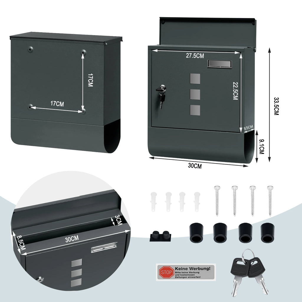 HIGH QUALITY & MODERNITY: The coated galvanized steel mailbox is robust, dimensionally stable, waterproof, rust-proof and durable. Anthracite in color and with clean lines, it is simple, elegant, modern and beautiful