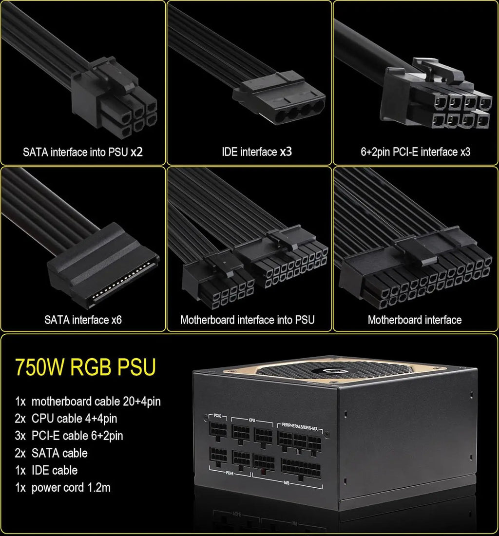 • 750W ATX PSU, high-performance computer power supply specifically designed to meet your power needs. With its sleek and stylish design, this power supply is perfect for both gaming enthusiasts and professionals alike.