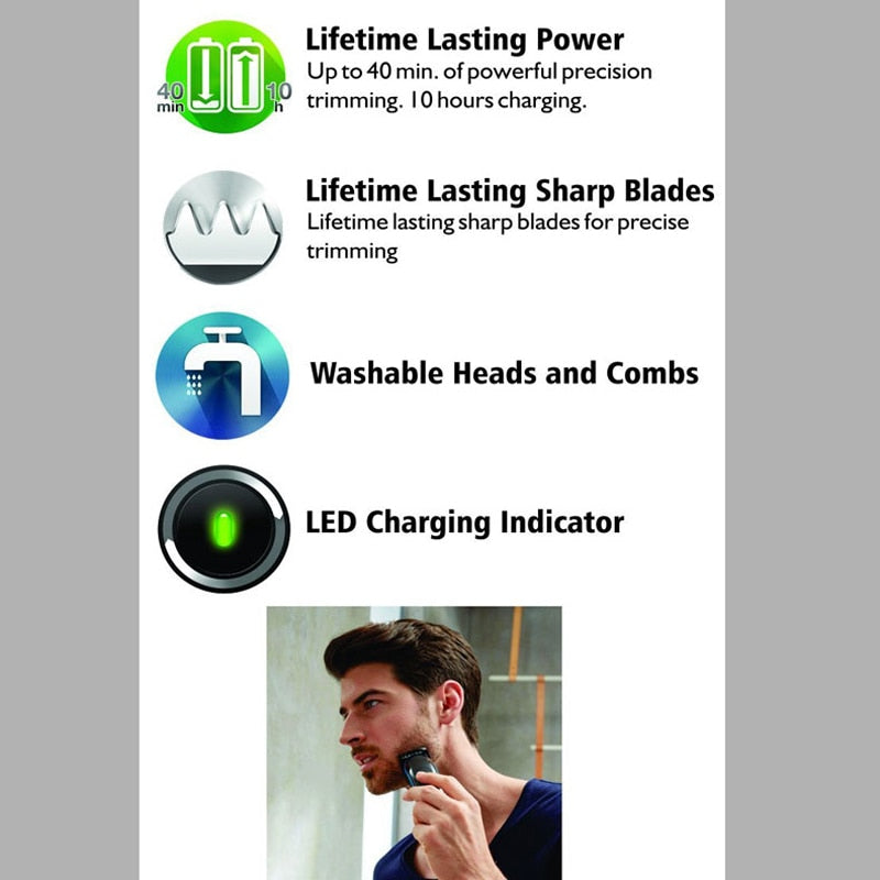 Six jobs in one device: Stubble, short, medium and long beards, hair clipping, ear and nose trimming
