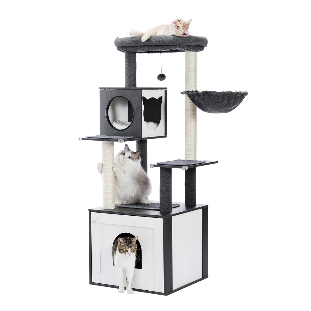 Cat Tree with Litter Box Enclosure Large Wood Cat Tower with Storage Cabinet and Cozy Cat Condo Sisal Covered Scratching Post
