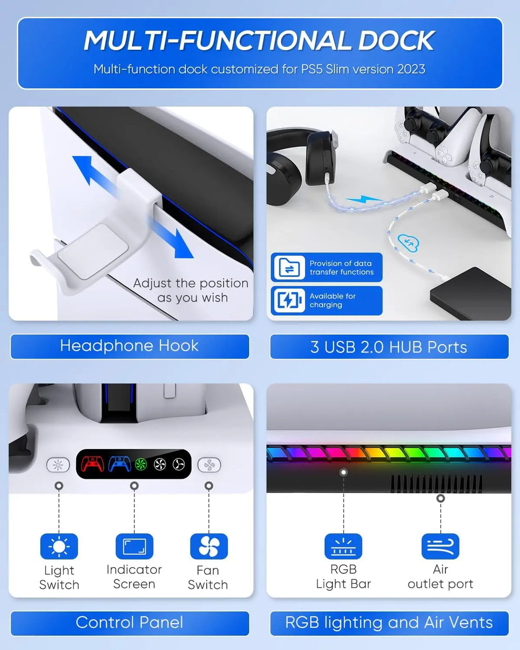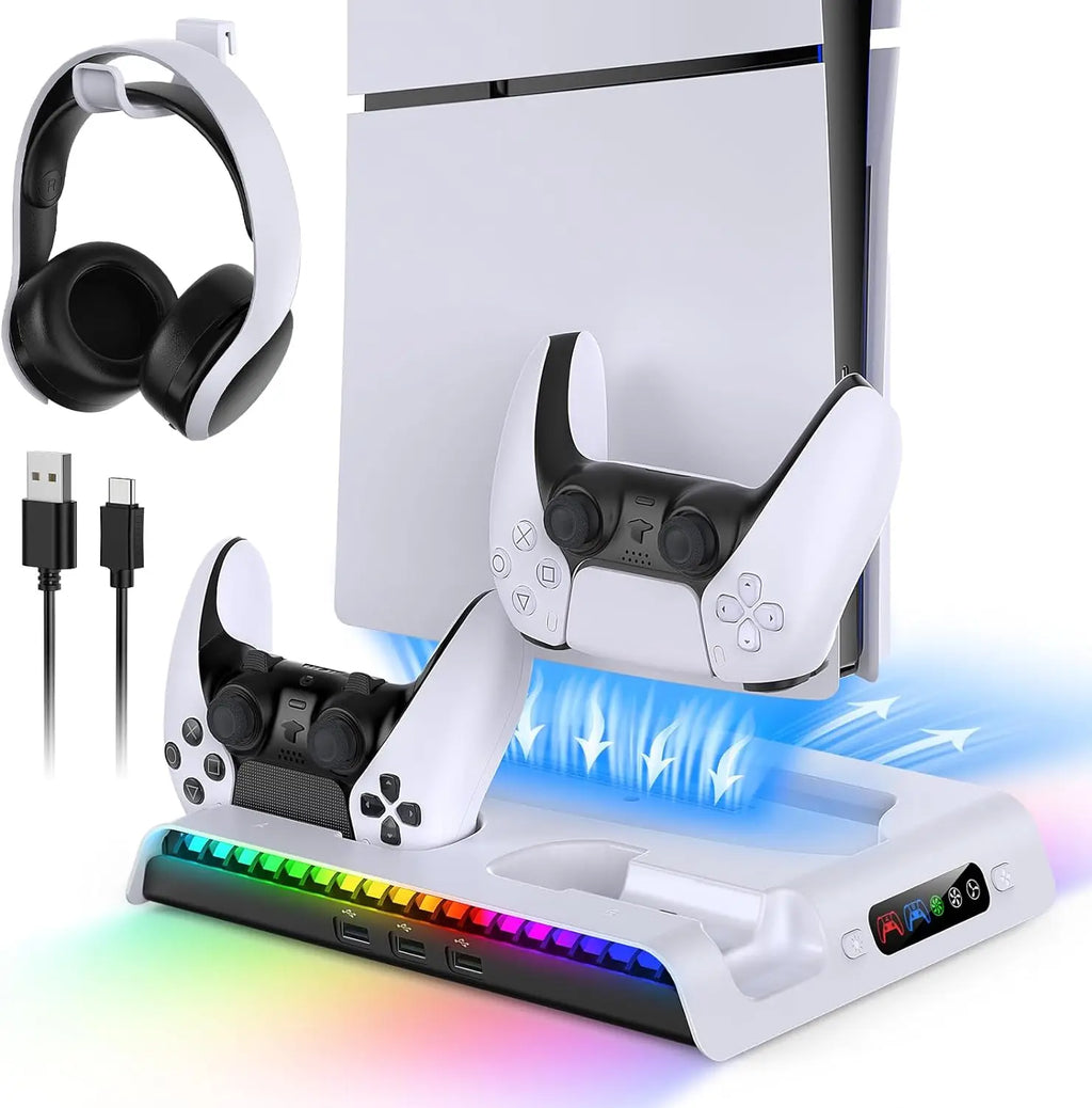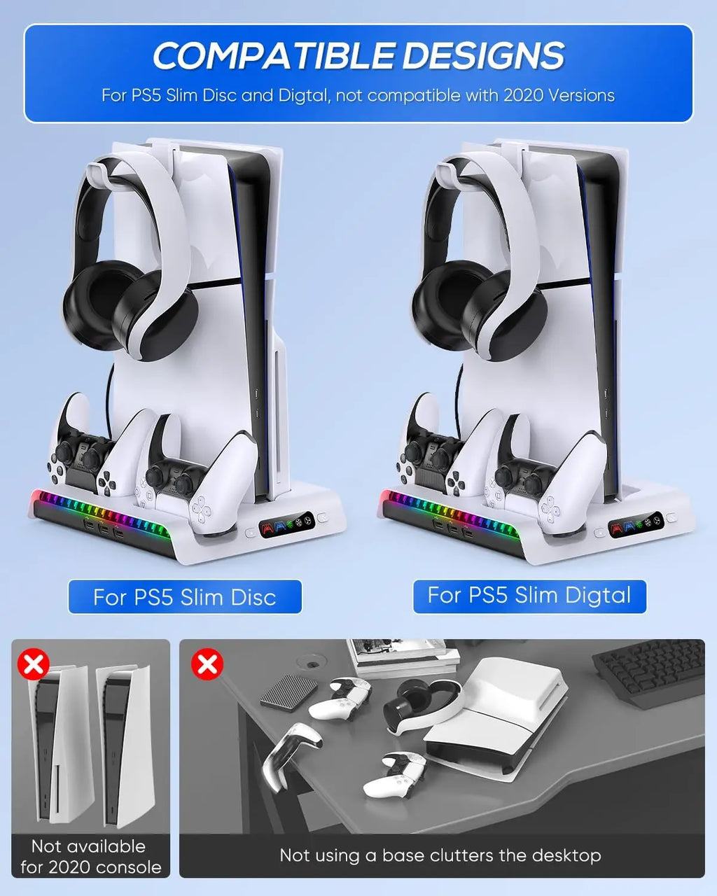 【RGB Charging Stand for PS5 Slim Console】The cooling stand for PS5 slim console is specially designed for PlayStation5 Slim Digital & Discs Edition, The charging station for PS5 slim equipped with dual controller charging port can charge for DualSense controllers, also for dualSense edge controllers. And the same color as the ps5 slim console, is the best replacement for official vertical base stand. (Note: Please set the USB ports of the console for PS5 to always supply power mode).