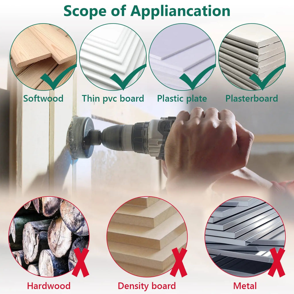 【MULTI-FUNCTION HOLE SAW SET】 The HYCHIKA hole saw sets are durable and reliable to use on workpieces, suitable for cork board, thin PVC board, plastic but not for hard board (density board and computer desk, etc.)