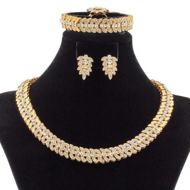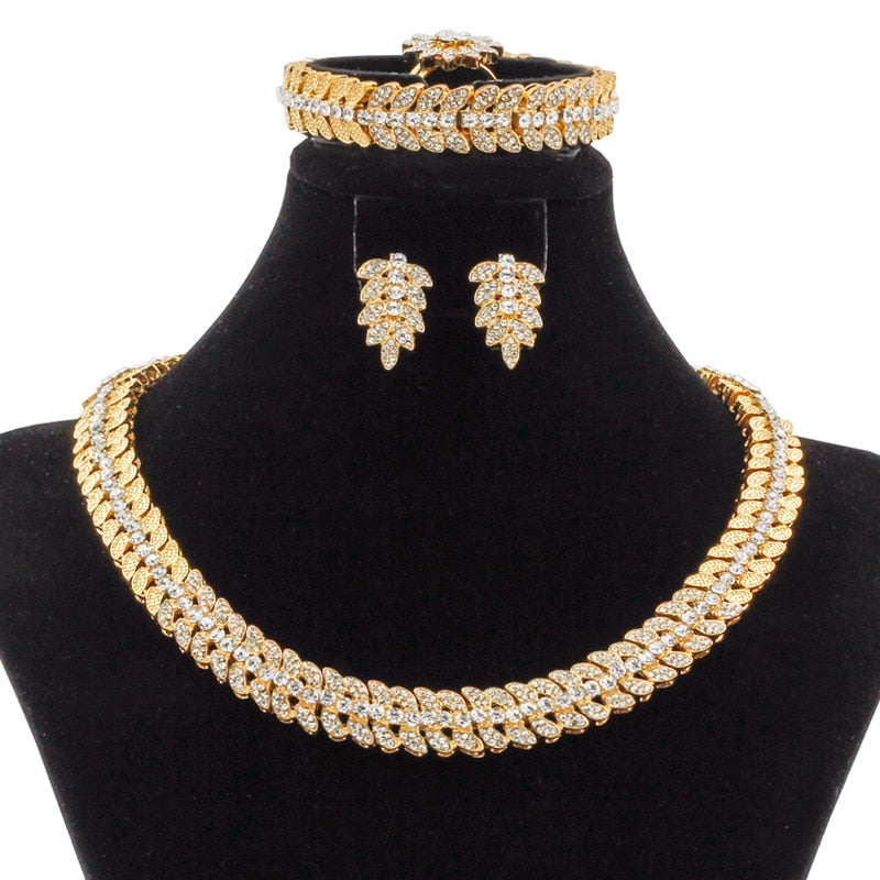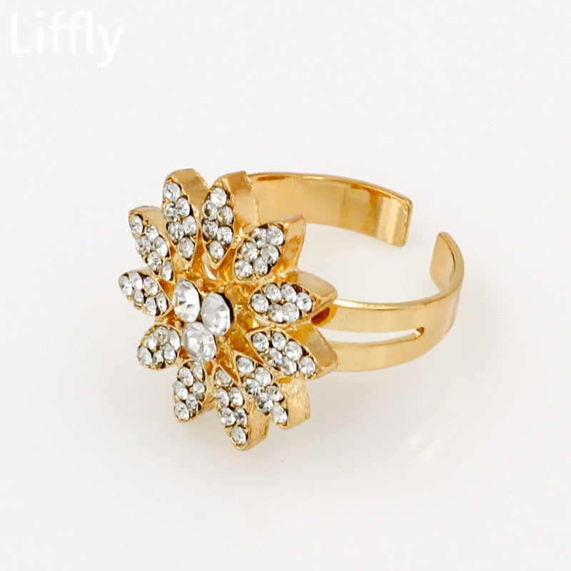 Liffly Fashion Dubai Gold Jewelry Sets Flower Shape Crystal Necklace Bracelet Ring Earring Bridal Wedding Jewelry Accessories