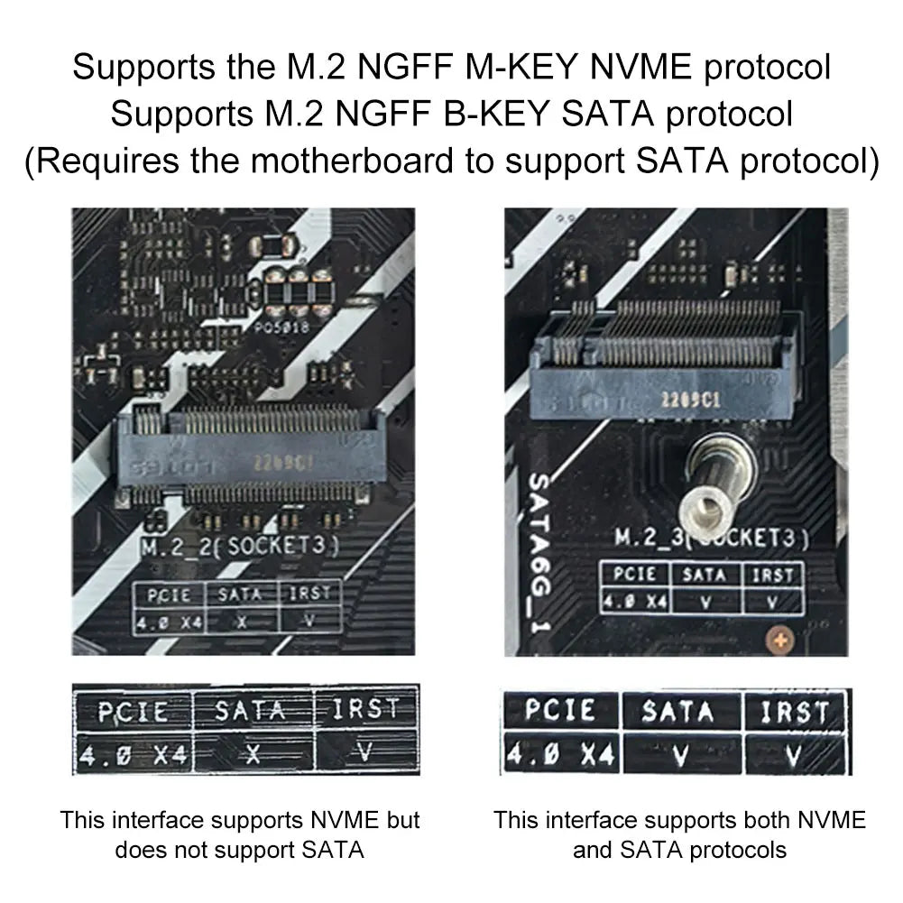 1. Broad Compatibility: The m.2 nvme ngff m-key ssd extension cable supports both M.2 NGFF M-KEY NVME and M.2 NGFF B-KEY SATA protocols (motherboard SATA support required), ensuring versatile usage across various devices.