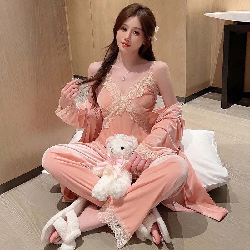 New Autumn Winter Velvet 3PCS Pajamas Set Sleepwear Sexy Lace Trim Women Kimono Bathrobe Gown Loose Casual Pijamas Suit Homewear