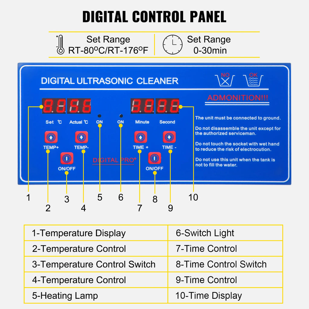 • 【DIGITAL CONTROL PANEL】 - The jewelry cleaner ultrasonic machine features a digital control panel, with an adjustable timer (0-30 min) and heater (RT-176℉/RT-80℃) displayed on LED. A heating function can effectively soften and dissolve oil and wax stains, thereby improving the cleaning effect.