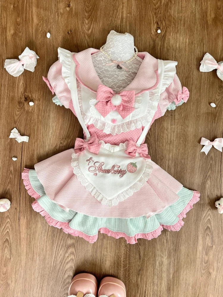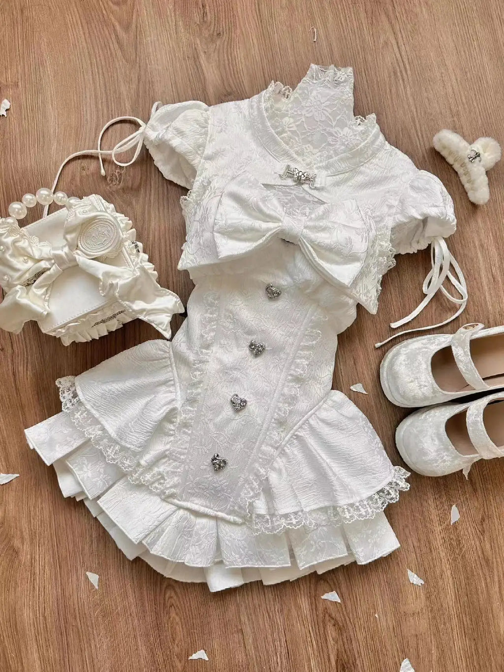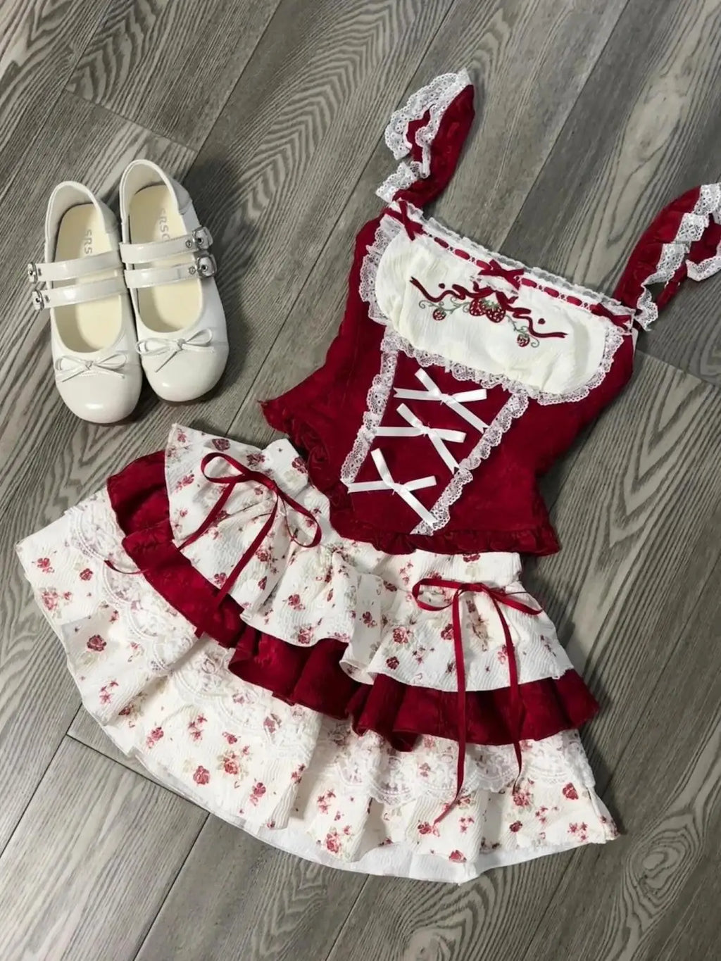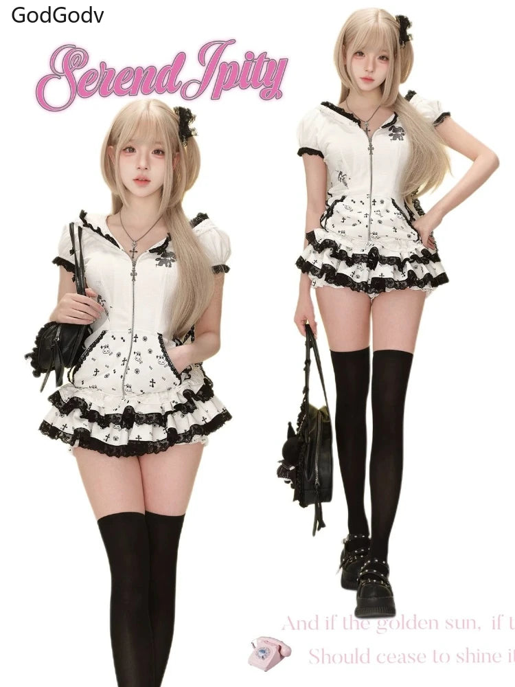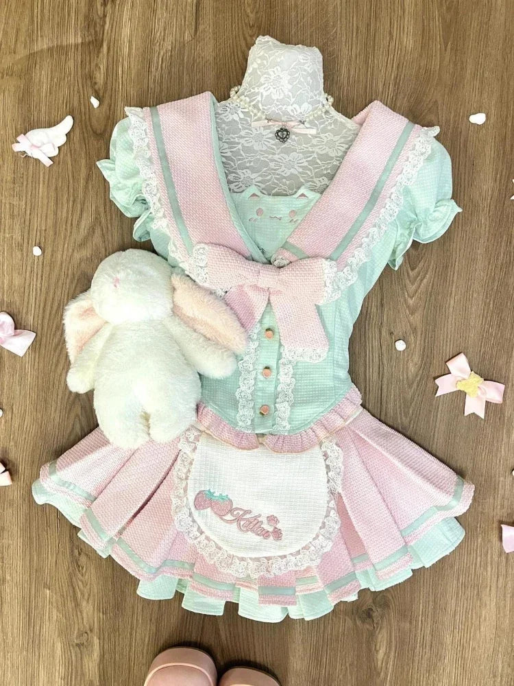 Summer Sweet Preppy Style 2 Piece Sets Women Y2k Kawaii Lolita Design Tops + High Waist Chic Skirt Female Princess Retro Outfits