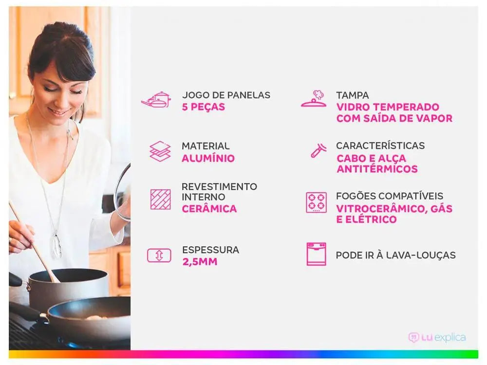 The Tramontina Glenz 5 Pieces Cookware Set is the ideal choice to complete your kitchen and ensure a simple and quality preparation for your meals. Ideal to accompany you on a daily basis, its pieces are developed in aluminum and have internal ceramic and external silicon coating, which together, cook food quickly and evenly. The pots and casseroles come with tempered glass lids, with steam output and stainless steel edges and their handles, handles and handles are in anti-thermal Bakelite, material that offers greater safety during handling. A game that can go to the dishwasher, optimizing your tasks in the kitchen. Facilitating your day to day. Choose Tramontina and make beautiful in all moments of your day to day!
