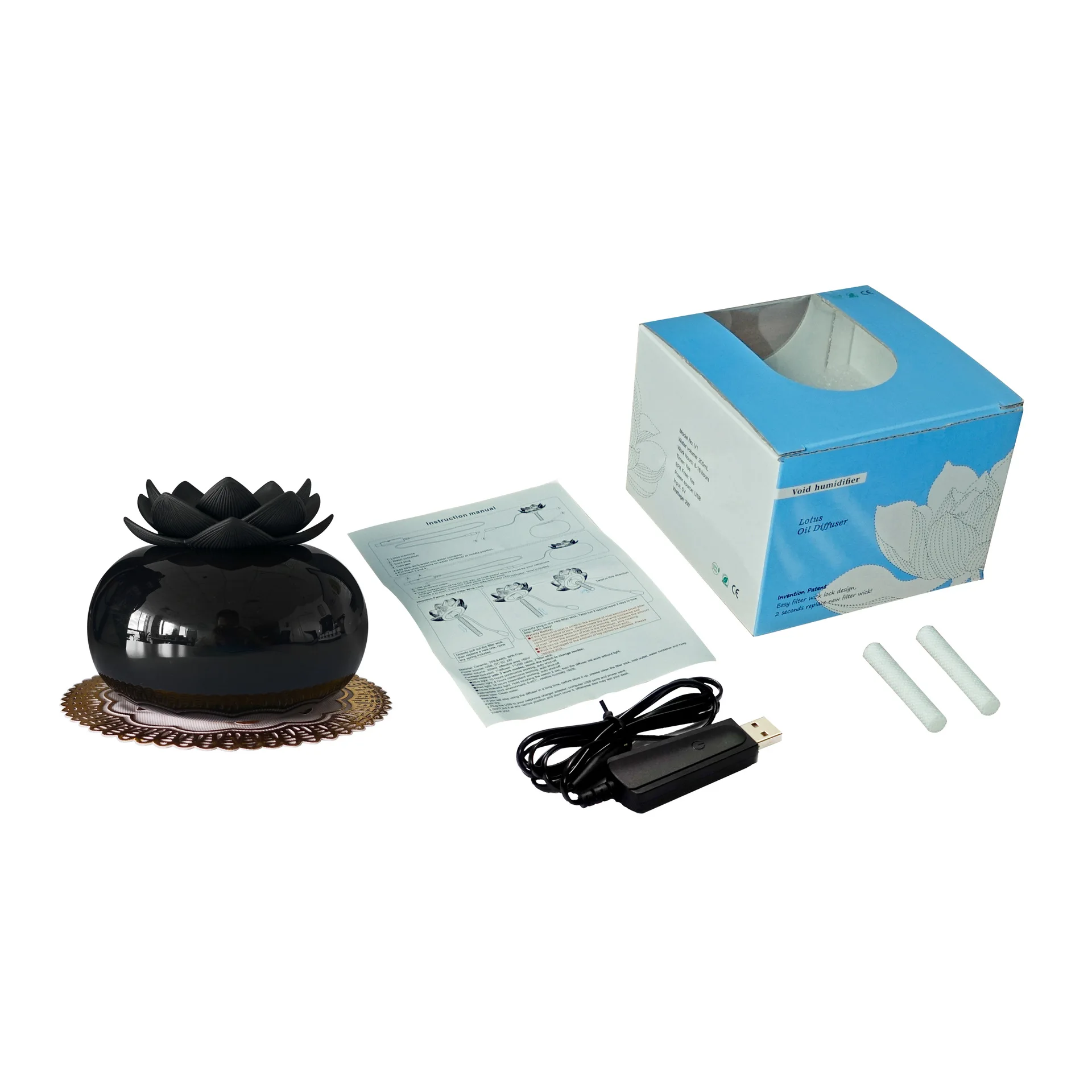 Package included: 1*diffuser, 1*USB cable, 1*pad, 2*sponge wicks