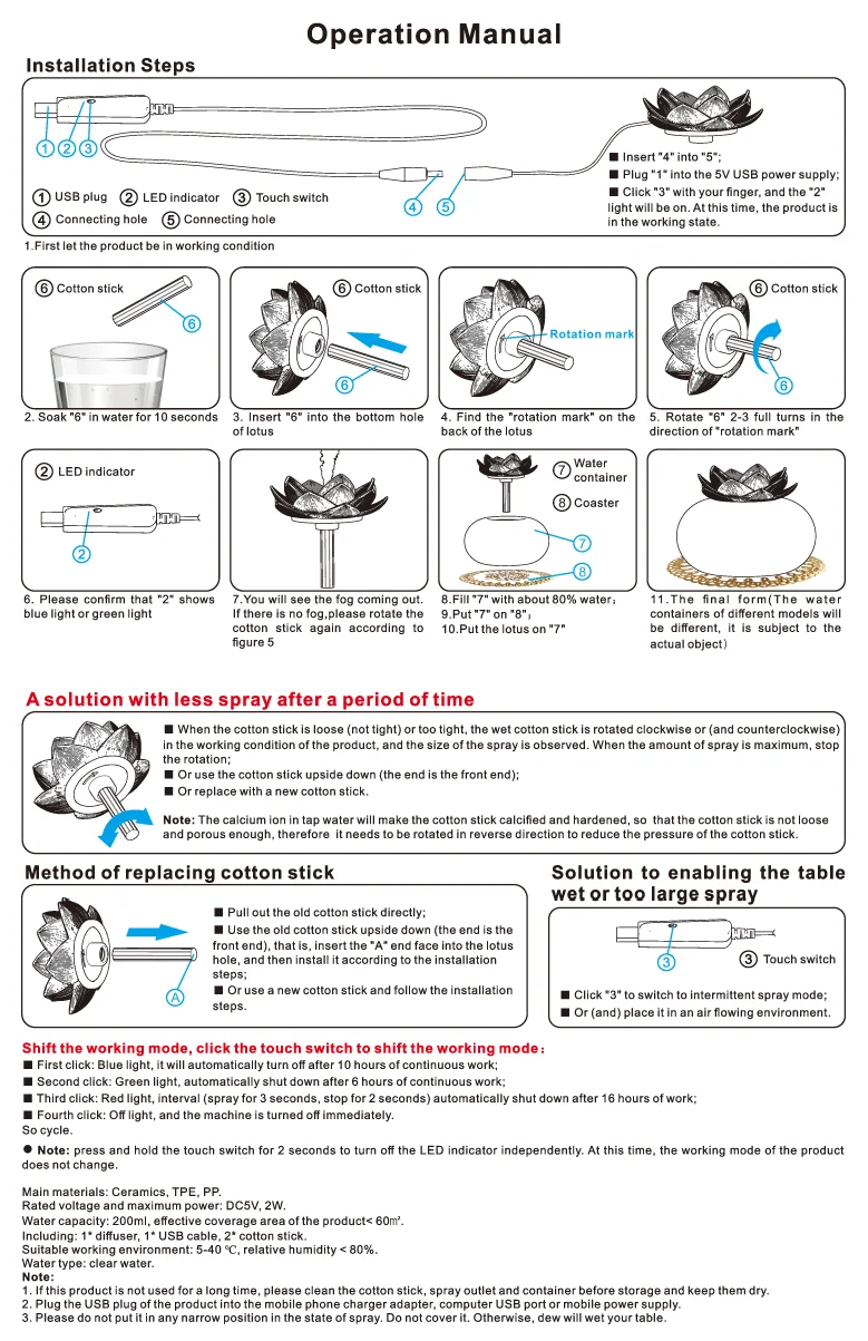 3. We recommend you to use essential oils which will be mixed with water faster, and regularly clean the top mist outlet can let the humidifier work better.