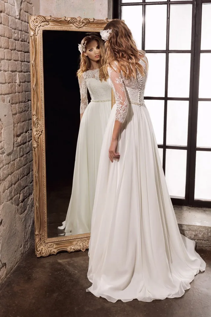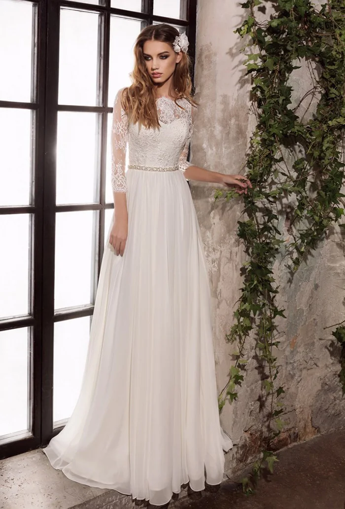 2022 Wedding Dresses Three Quarter Sleeves Top Lace Chiffon Wedding Gowns with Beading Sashes Vestido De Noiva