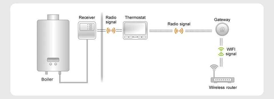 3, Wireless two-way communication between thermostat and receiver/gateway by RF.