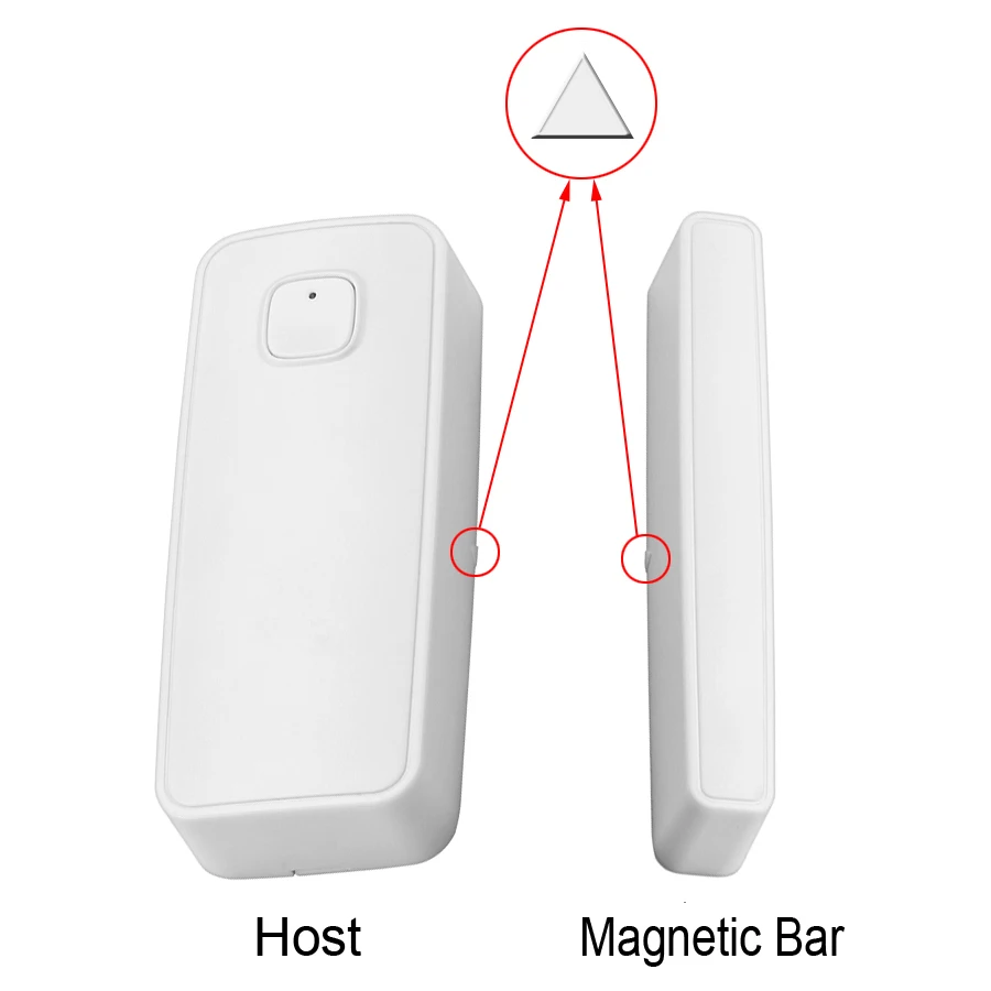 The Host and Magnetic Bar both have a triangle “△” in the side. To install the door sensor, please use double-sided adhesive tape or screws to fix them, meanwhile to align the triangle with another.