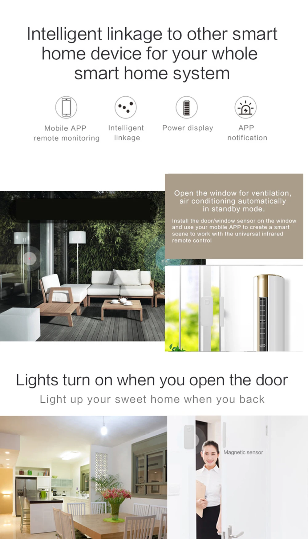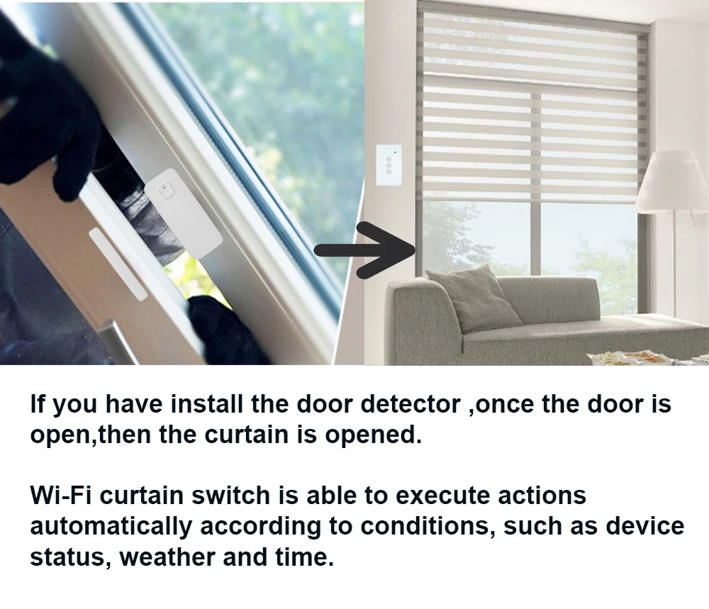 By creating “Automation” in App, the door sensor is able to send signals to activate other Tuya smart home devices when the door open/close status changes . Please note:The wifi socket,smart remote control and smart breaker are not included in the package.