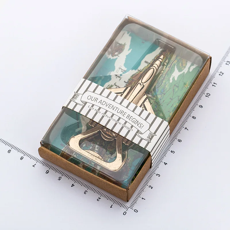 Don\'t let these pretty favors fly away! Guests will adore this practical and adorable "Let the Adventure Begin" Airplane Bottle Opener that\'s perfect for a destination wedding. If guests have traveled far and high to attend your event, you want to give them something good!