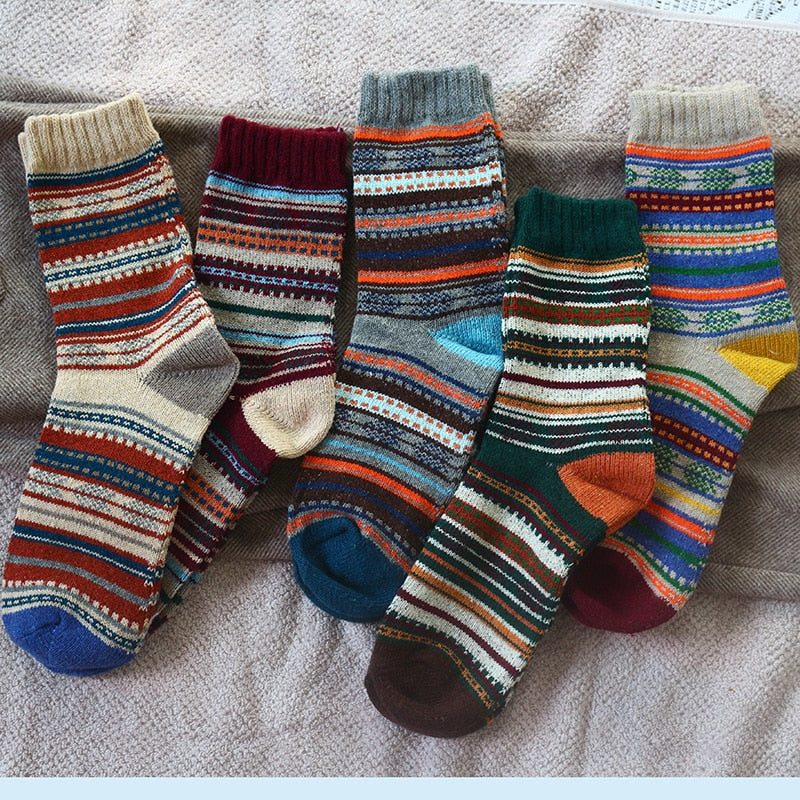 Winter New Men's Thick Warmth Harajuku Retro High Quality sStriped Fashion Wool Casual Socks 5 Pair