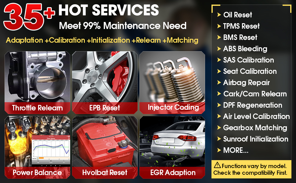 3. 35+ Hot Reset Service: Widely integrate adaptation, calibration, initialization, relearn and matching to meet your need in the most degree. Along with all the common maintenance functions, it also comes with advanced special functions including Cam/Crank Sensors Relearn, Idle Relearn, Zero-Point Calibration, Fuel Trim Reset, Power Balance, etc. ✔Get More 100+ Repair Function for Specific Models from "1.Diagnose" > "2.Car Model" > "3.System" > 4."Special Funciton".