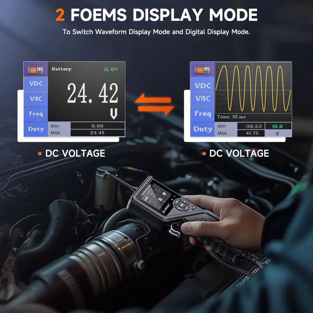✔️ Test DC Voltage, AC Voltage, Frequency, Duty Cycle, Fuel Injection Circuit, Resistance, and Diode. Especially, in AC Voltage, Frequency, Duty Cycle and Fuel Inject Modes, user can long press the mode button for 3 seconds to switch between Waveform Display Mode and Digital Display Mode.