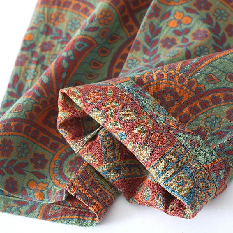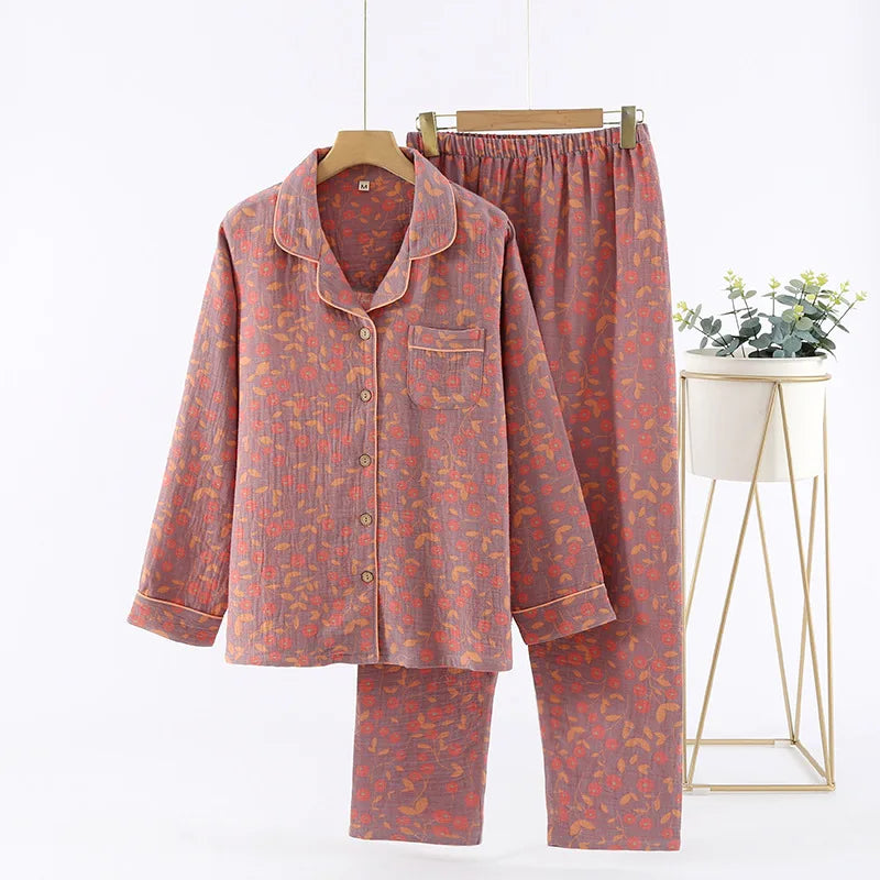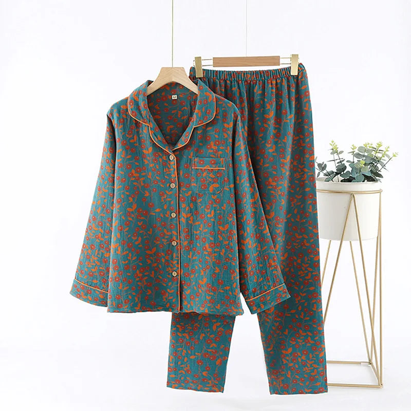 Autumn Long Sleeve Sleepwear Women's Cotton Yarn-dyed Jacquard Ethnic Style Print Pajamas for Women 2 Pieces Outfit Loungewear