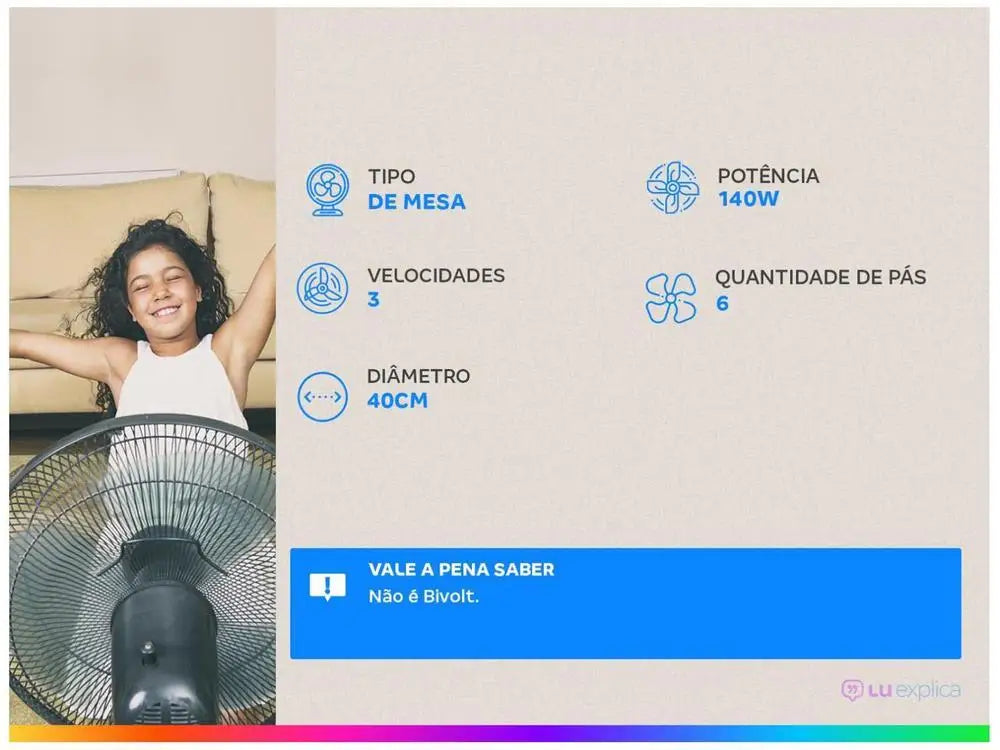 With 40cm and 3 speeds, the Turbo Fan VSP-40-B from Mondial has a low noise level, lateral oscillating system, adjustable vertical inclination, besides being compact and having low consumption. Its propeller has design and aerodynamic, which provides a strong wind through the six blades. For wider environments, you can use its oscillating system. Since the front grille is removable, it is still easy to assemble and disassemble for cleaning. It is also easy to carry because it has a handle for carrying. Already the non-slip base brings more security. The 40cm Turbo VSP-40-B Fan is designed for home use.