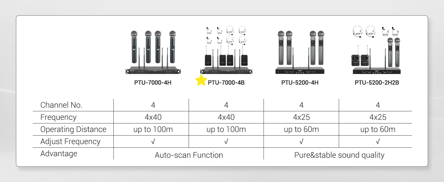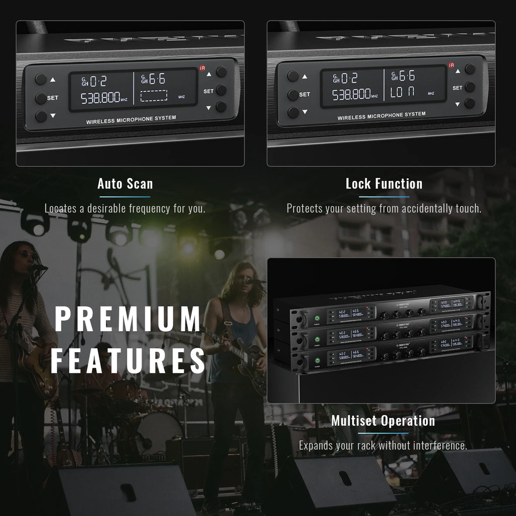 Sturdy metal builds for the wireless receiver and quality build for bodypack transmitters. The beige flesh toned color of the wireless headsets and lavalier mics enable great invisibility and professionalism during the performance. The mic cartridge is engineered for clear robust optimal true sound. Multichannel feature with 4x40 channels, enables users to select different frequencies when preset frequency fails, thus ensuring reliable performance