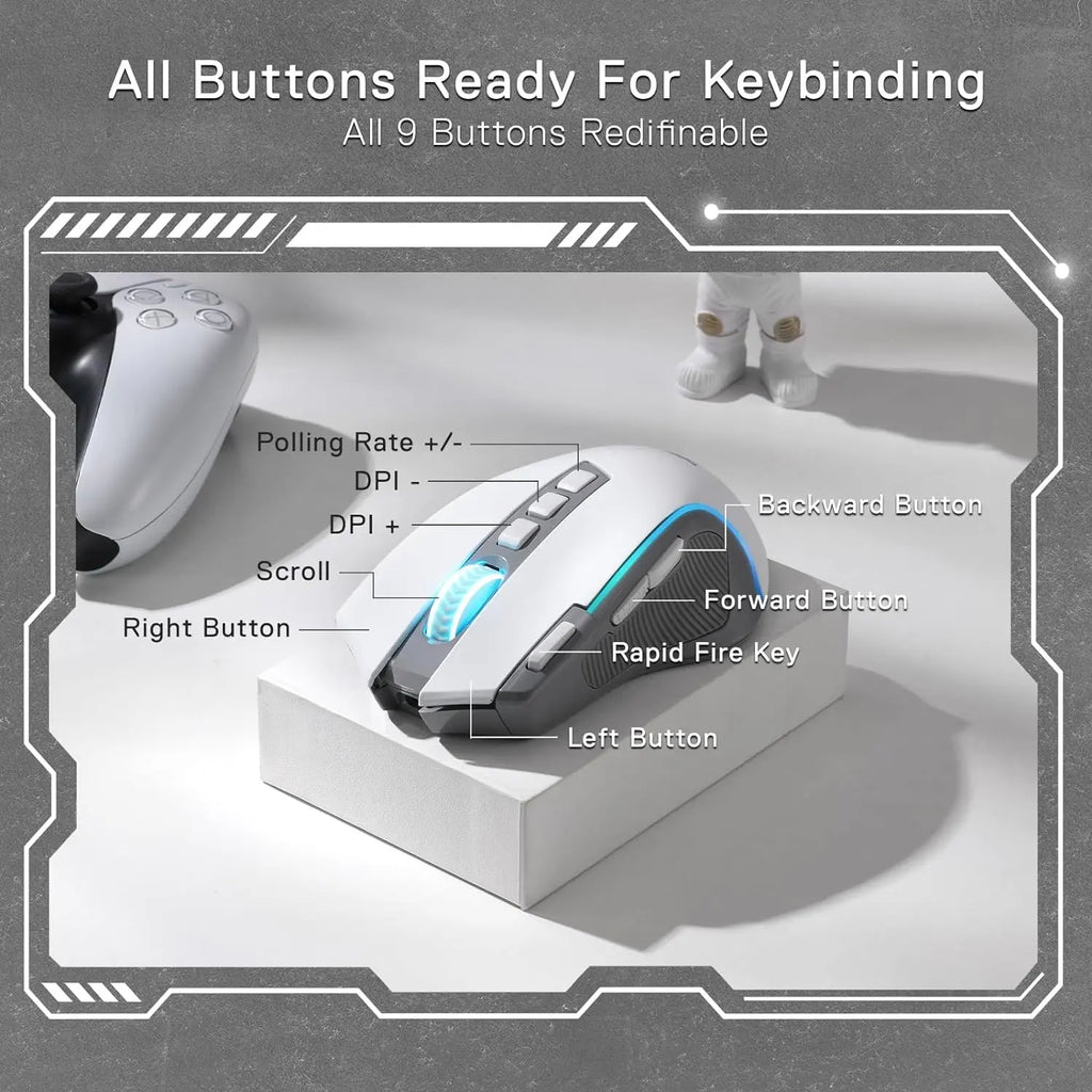 Redragon M612 PRO RGB BT 2.4G Gaming Gamer Mouse, 8000 DPI Wireless Optical 9 Programmable Buttons 7 Backlit Modes, B