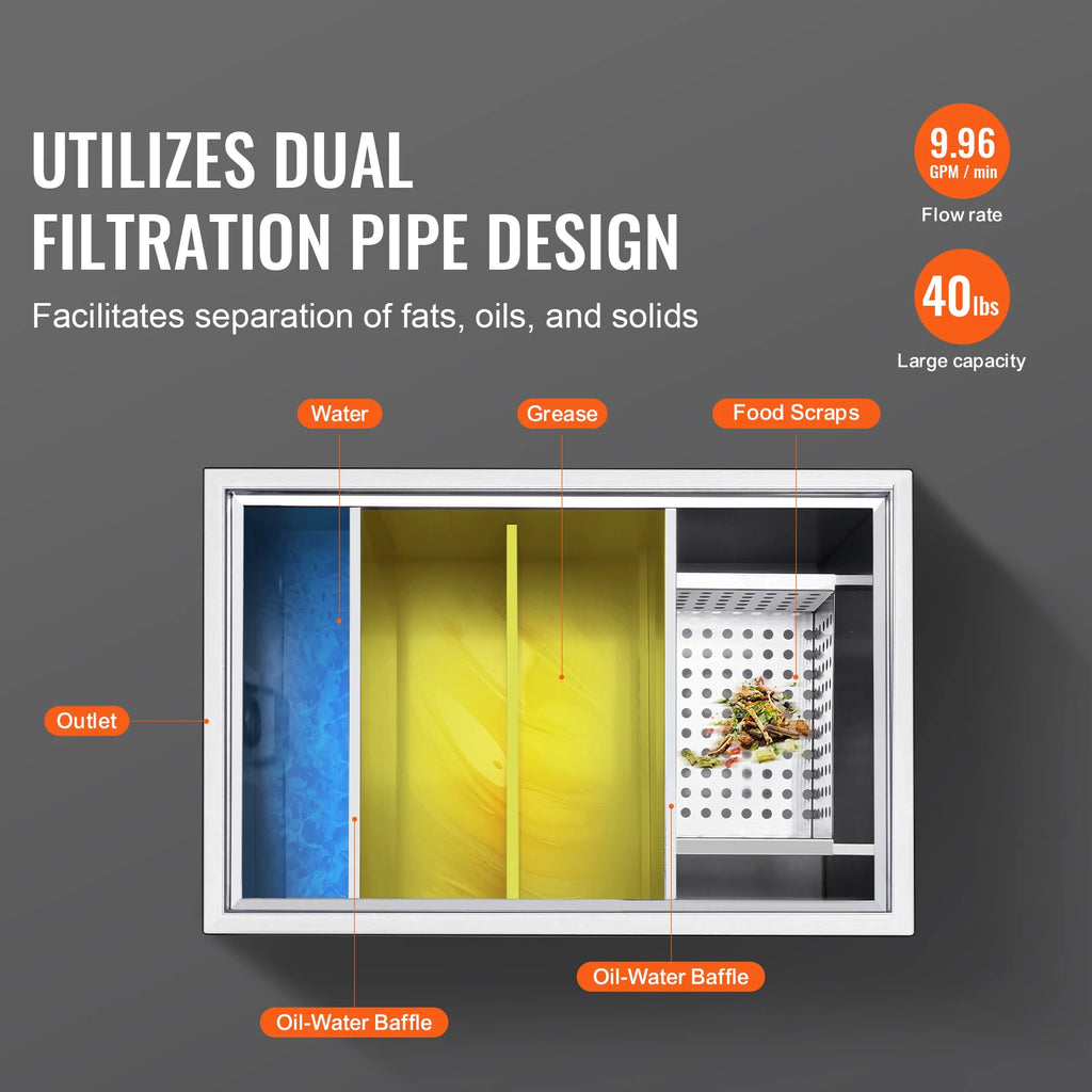 • High Efficiency: This commercial grease trap features a dual path filtration pipe design, significantly enhancing its filtering efficiency. With a high flow rate of up to 2.78 GPM/min, it ensures continuous wastewater flow and smooth grease capture, preventing grease accumulation in the pipes.