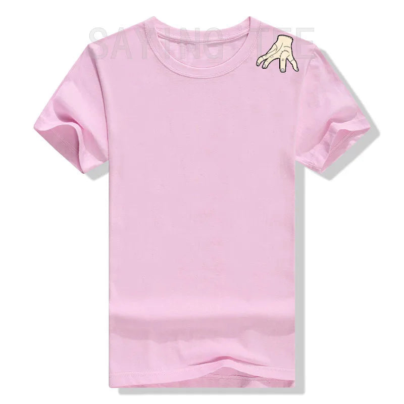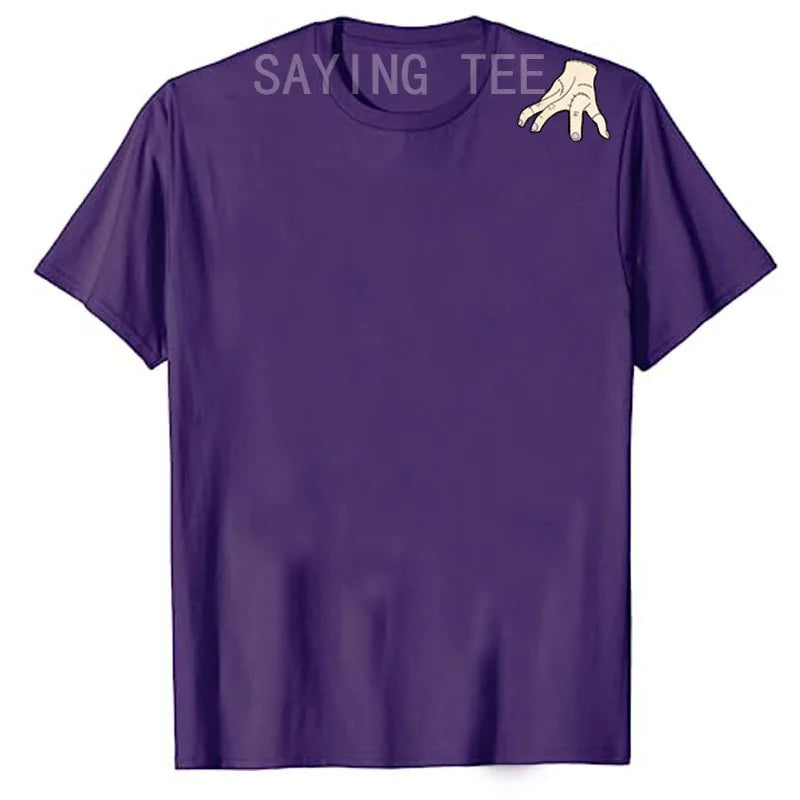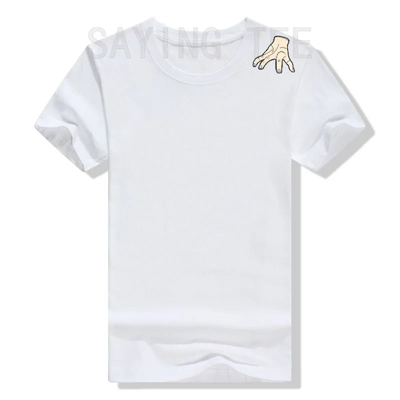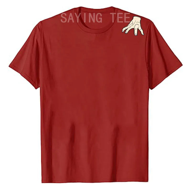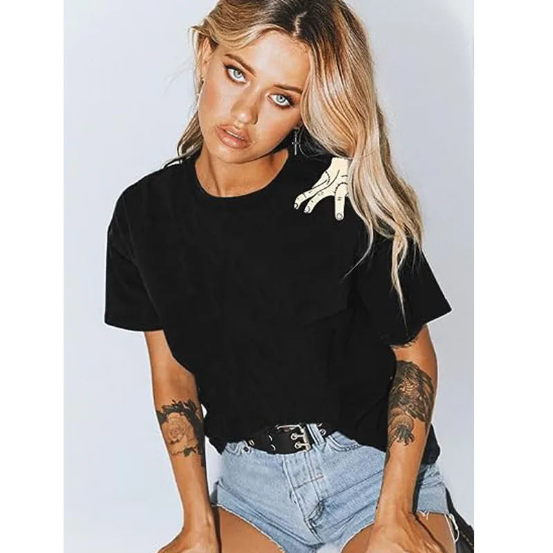 The addams cute graphic tee has a unique design. It's funny with that cute and spooky thing hand, which falls on your shoulder. It's a classic crew neck, short sleeves, casual and funny shirt. It easily matches with your clothes, like your earrings, necklace, bags, jeans, shorts, trousers, leggings, heels and boots. Match this gothic wednesday addams clothing with your stylish look to show your charm and beauty in this summer!
