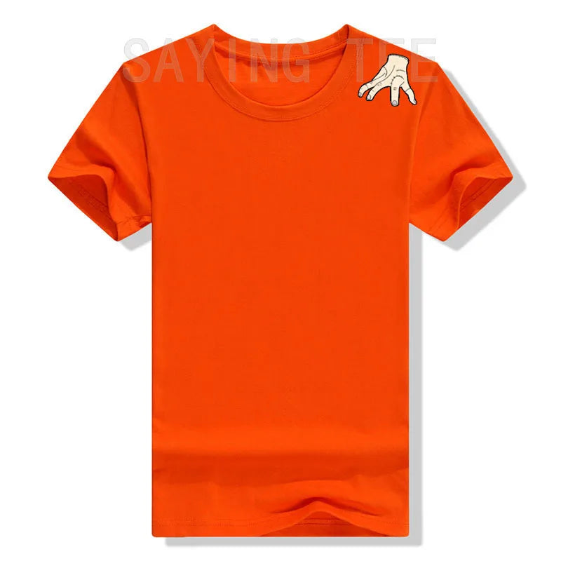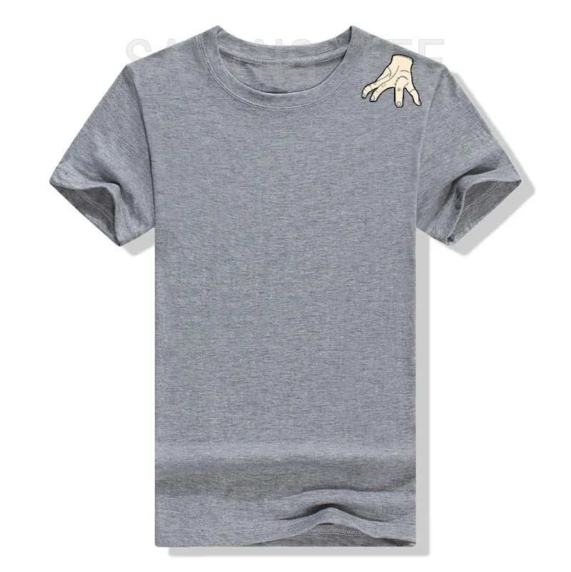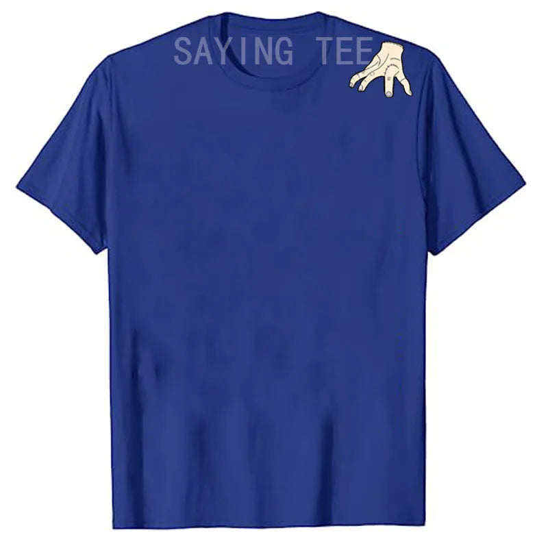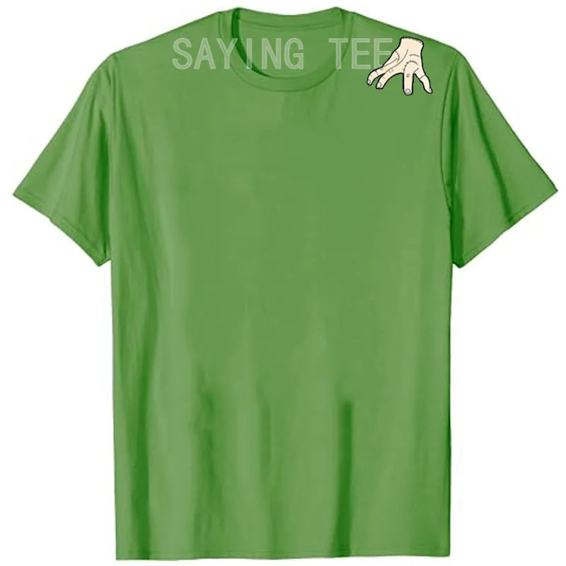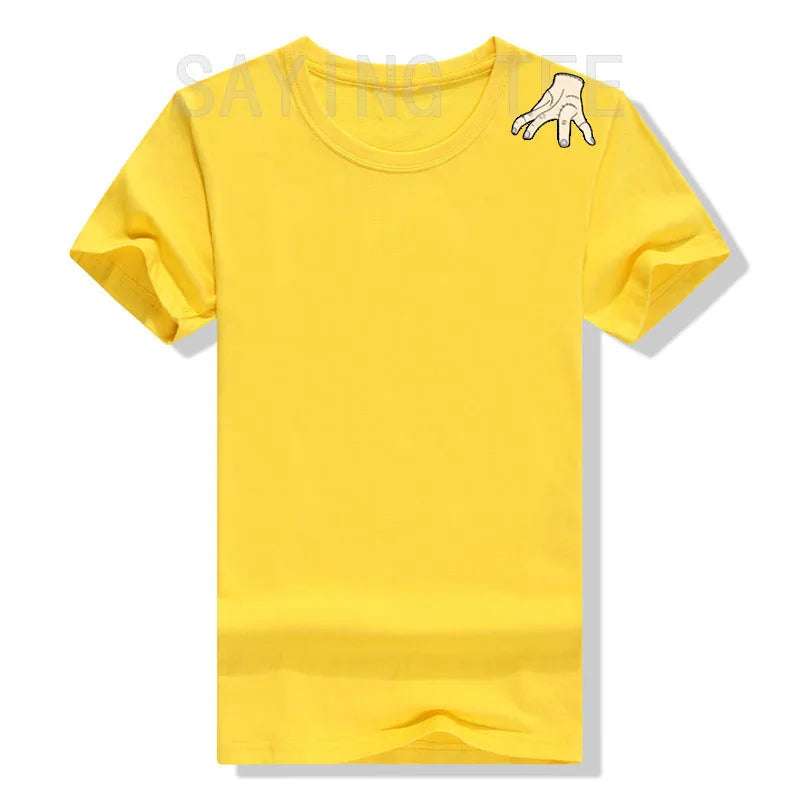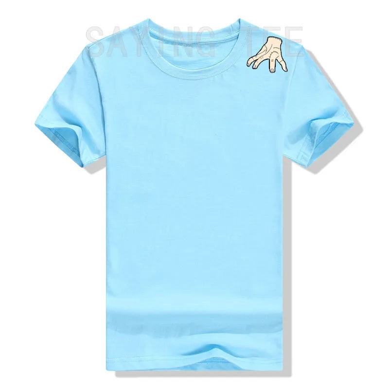The addams cute graphic tee has a unique design. It's funny with that cute and spooky thing hand, which falls on your shoulder. It's a classic crew neck, short sleeves, casual and funny shirt. It easily matches with your clothes, like your earrings, necklace, bags, jeans, shorts, trousers, leggings, heels and boots. Match this gothic wednesday addams clothing with your stylish look to show your charm and beauty in this summer!