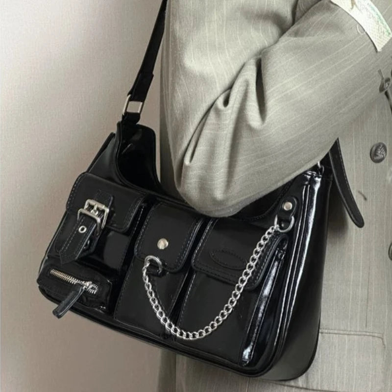 Y2k Womens Shoulder Bag Harajuku Fashion Gothic Casual Black Chains Handbag Hot Girls Pu Leather Ladies Motorcycle Bag Sac