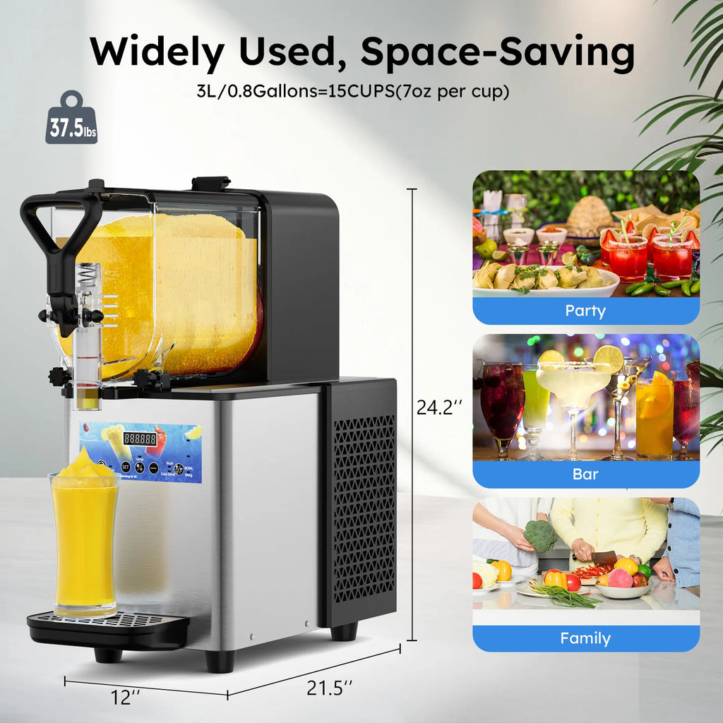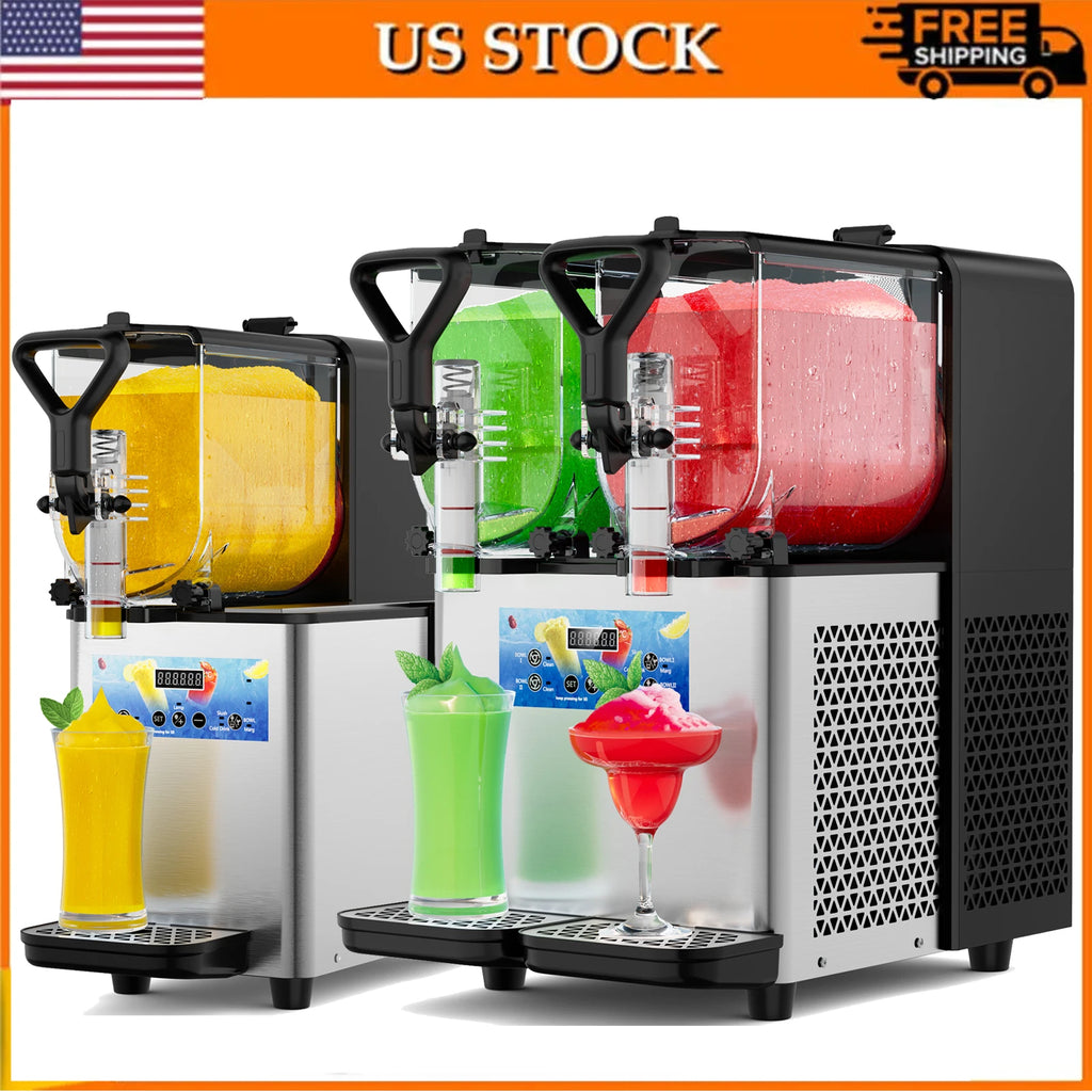 This commercial slushy machine is a must-have beverage equipment. It adopts the stainless steel body and PC cylinders, and is robust and healthy to use. Premium compressor with a full copper condenser ensures fast refrigeration, significantly improving the efficiency of making slushy. The control panel with a digital display screen is effortless to use. It is ideal for both commercial and home use.