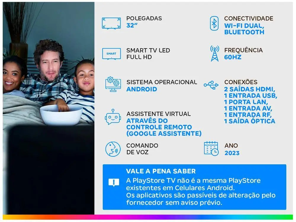 Aviso Importante: A PlayStore TV não é a mesma PlayStore existentes em Celulares Android. A exposição ao ruído na potência acima de 85 decibéis pode causar danos ao sistema auditivo