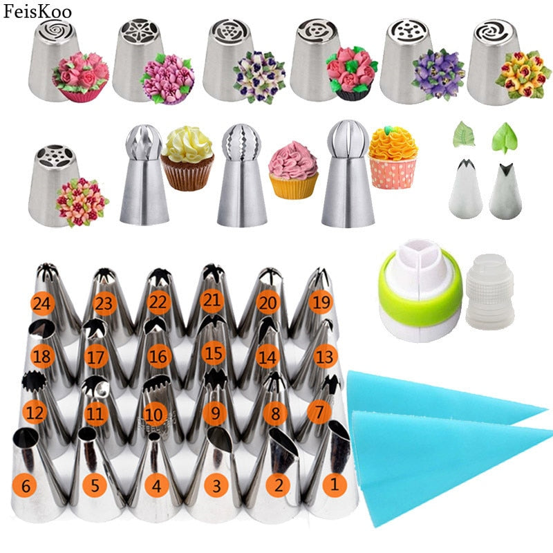 Package Include:1 set cake tools (7pcs russia nozzle+3pcs ball nozzle+2pcs leaf nozzle+24pcs small nozzle+1pc big converter+1pc small converter+2pcs silicone bag)