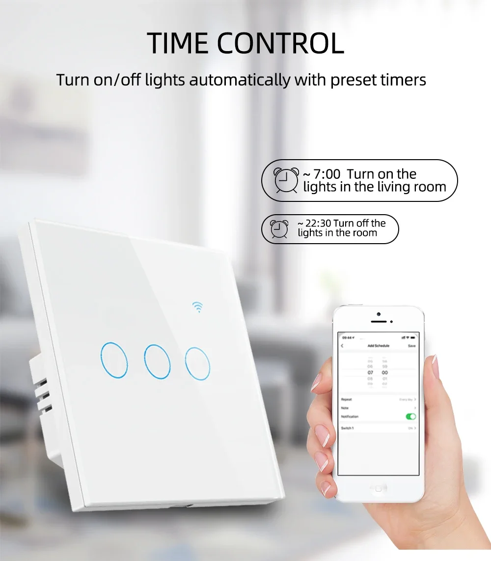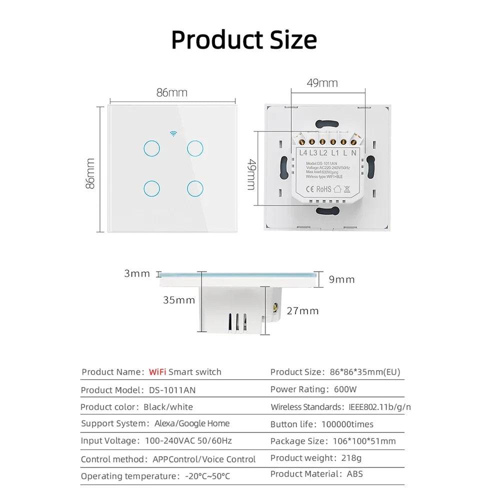 6.Safety and Certification:The wall switch adopts premium materials, such as fire-resistant shell, phosphor bronze connects and advanced PC+TEMPERED GLASS, can provide fire prevention, overload protection to protect your family.