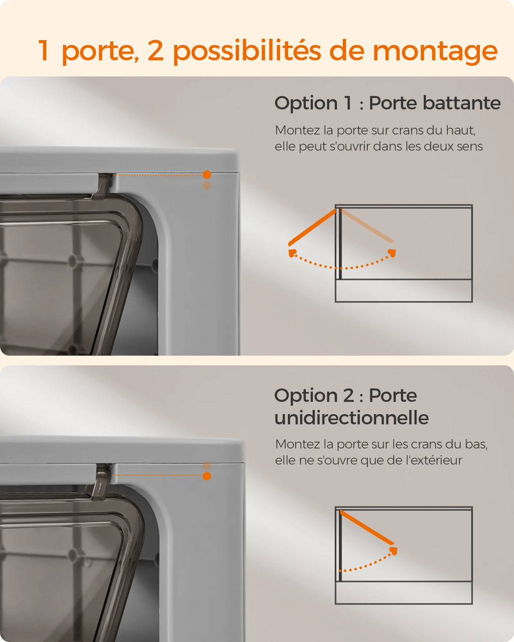 Si vous installez la porte sur les crans du bas, c'est une porte à sens unique. Sur les crans du haut, il s'agit d'une porte double sens.