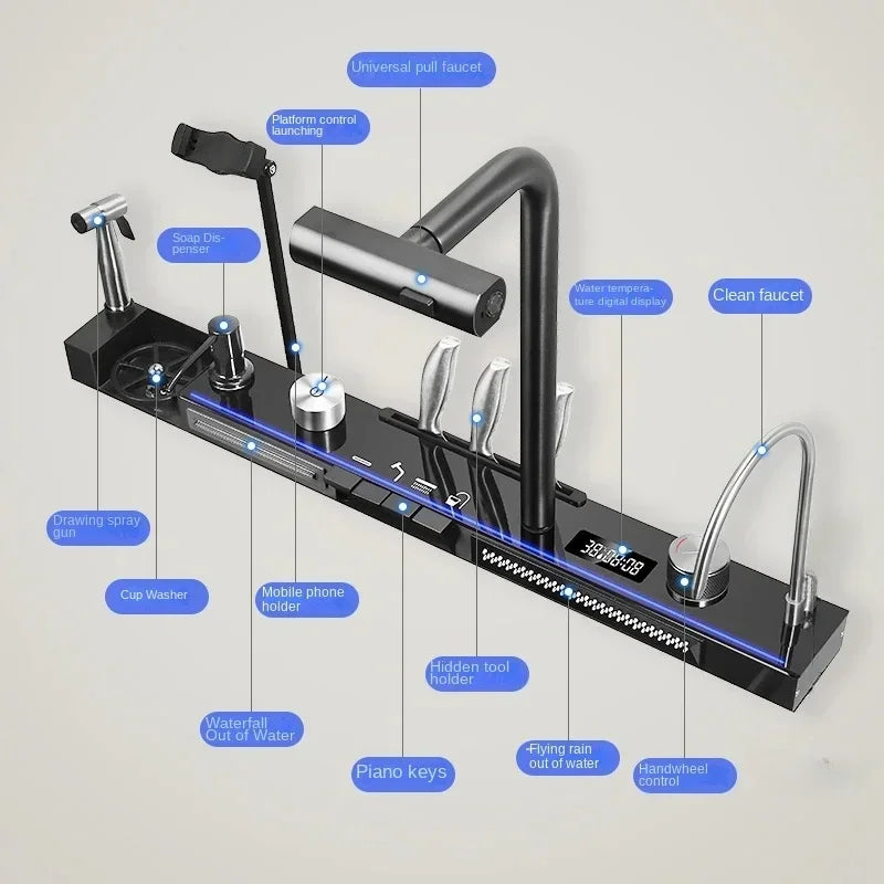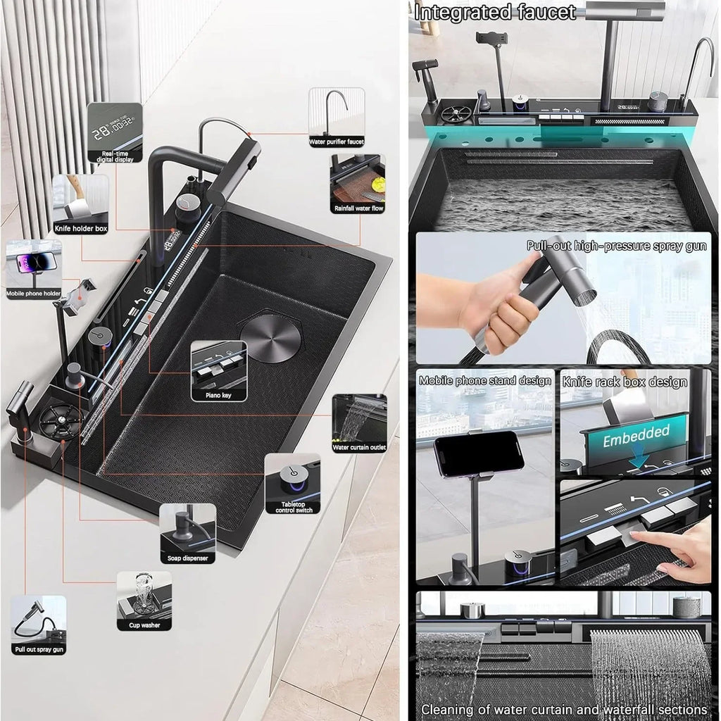 Large Single Slot Kitchen 304 Stainless Steel Waterfall Sink, Digital Display Embossed Washing Basin Household washing Sink